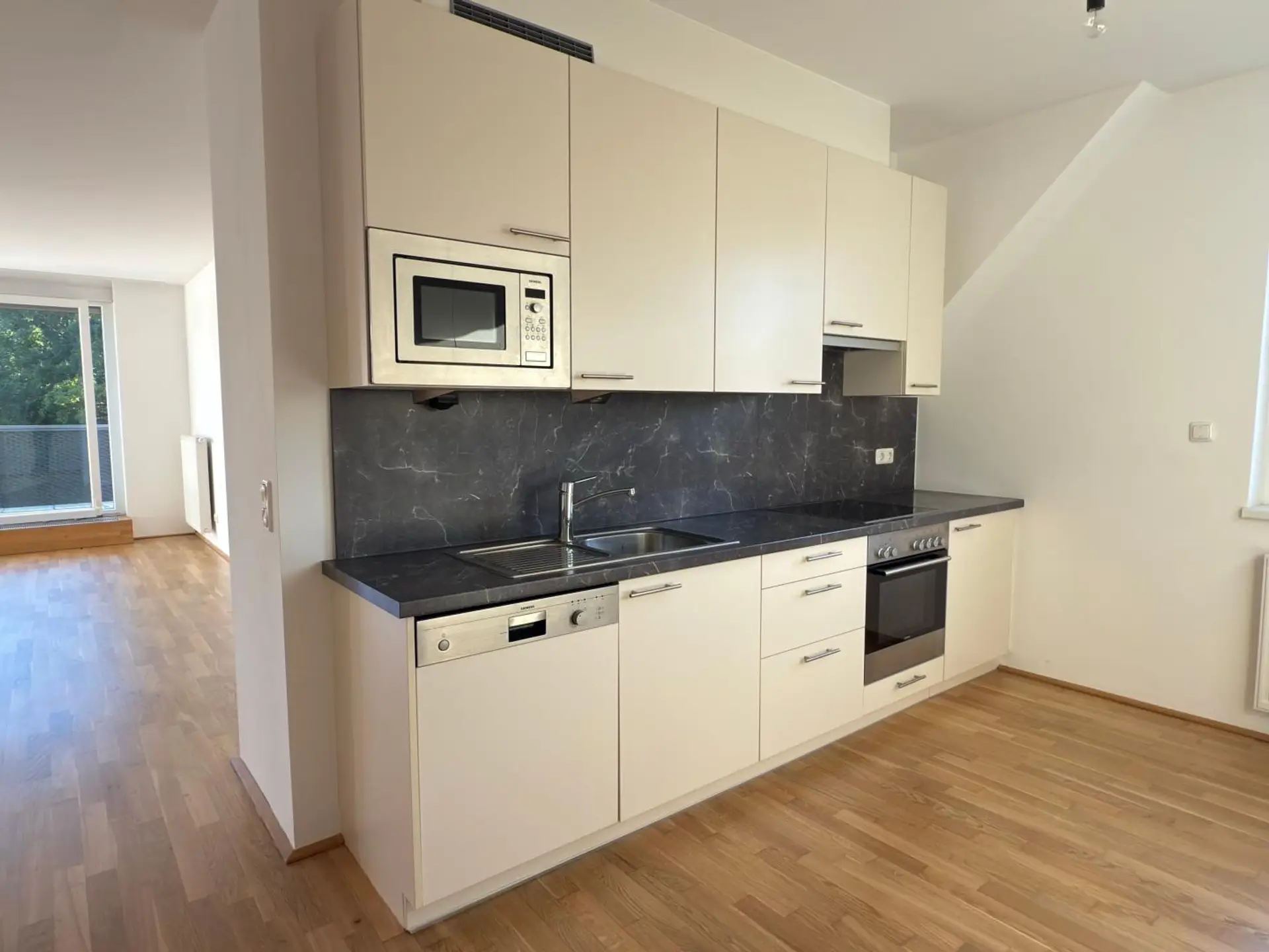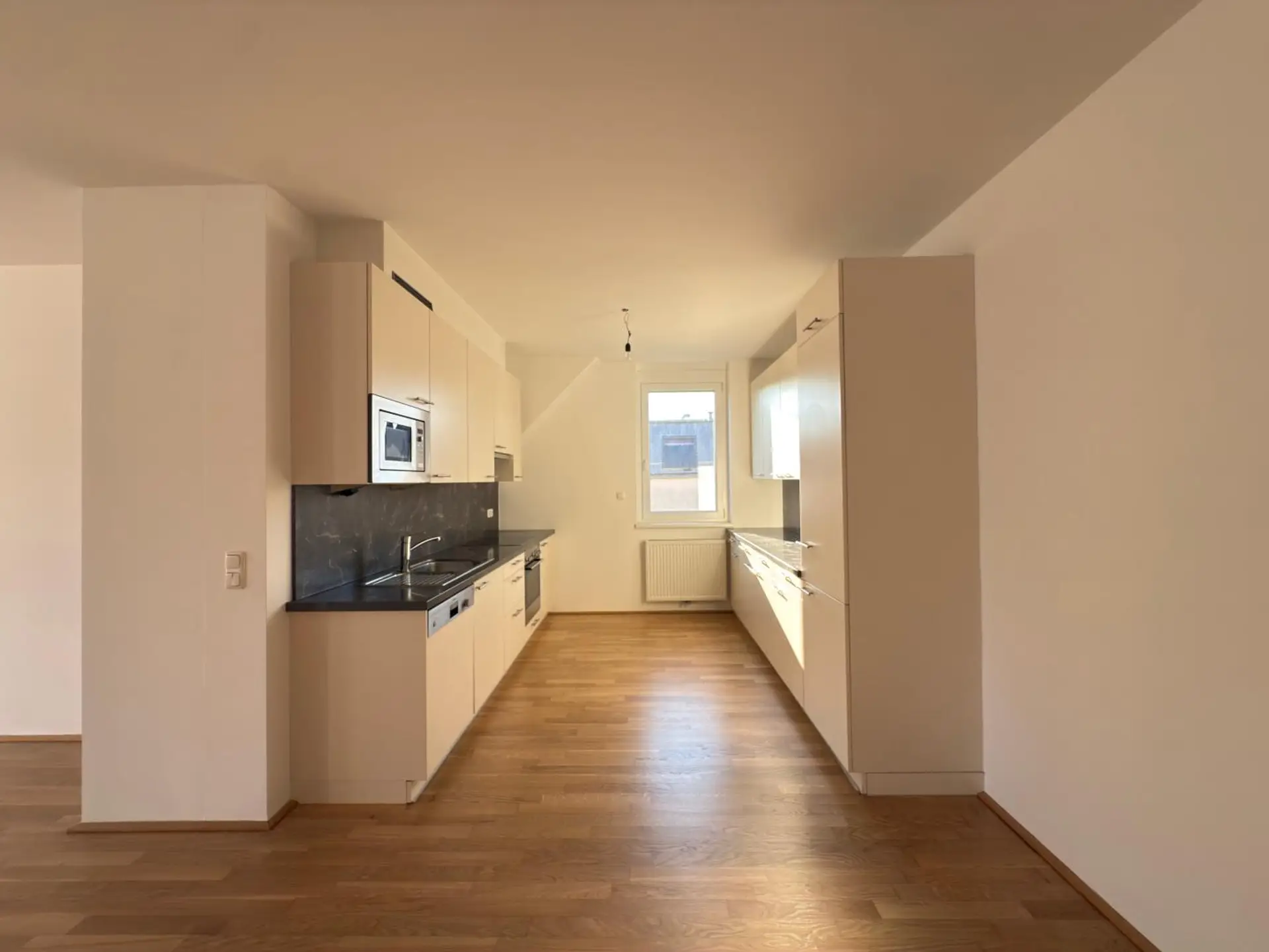 Die Wohnung überzeugt durch ihre offene, einladende Wohnküche, die bereits mit einer modernen Küchenzeile ausgestattet ist und viel Platz für geselliges Kochen bietet. Ein separates Zimmer verfügt über stilvolle Einbauschränke, die für Ordnung sorgen und zusätzlichen Komfort schaffen. Großzügige Fensterflächen durchfluten alle Räume mit Tageslicht und schaffen eine freundliche, angenehme Atmosphäre.