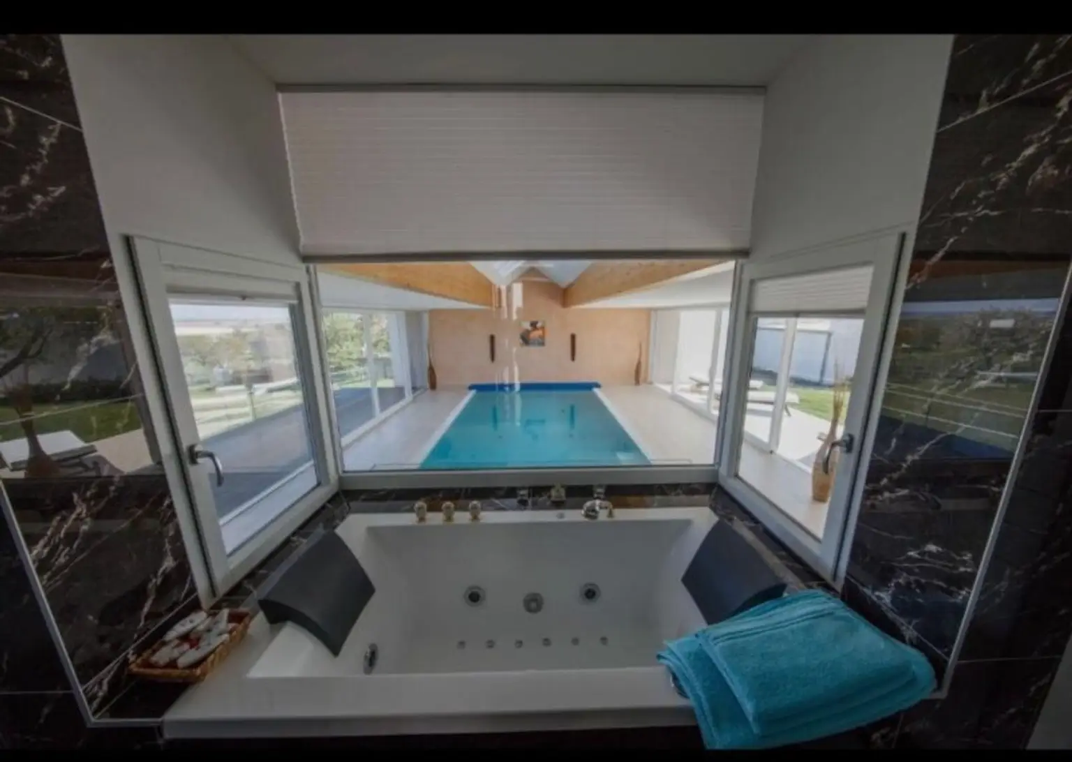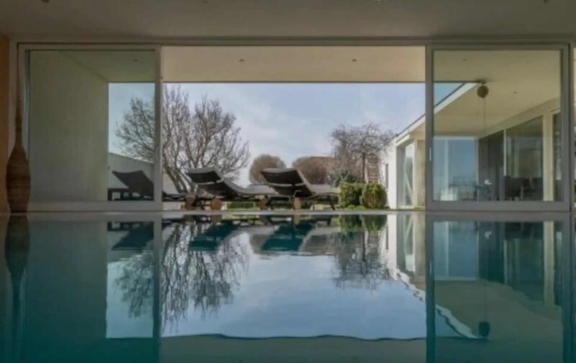 * Hallenbad ca. 7,5 x 4,5 m mit bodentiefen Glasschiebetüren und Ausgang auf eine Terrasse mit Seeblick