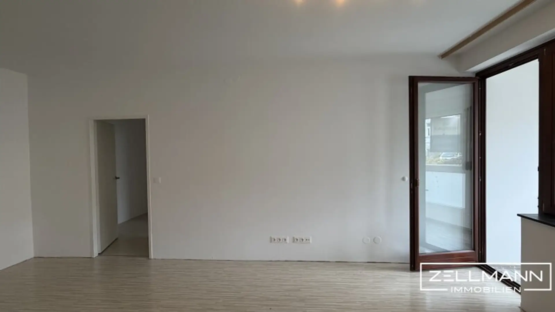 Helles Wohnzimmer mit Zugang zur verglasten Loggia (21,74 m² + 5,79 m²)