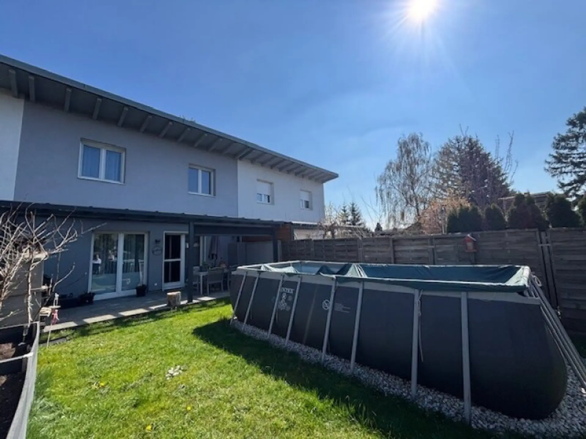 Bereits beim Betreten des Hauses vermittelt der helle Eingangsbereich ein angenehmes Wohngefühl. Das Erdgeschoss bildet mit der großzügigen, offen gestalteten Wohnküche das Herzstück des Hauses. Große Fensterflächen sorgen für eine lichtdurchflutete Atmosphäre und schaffen eine harmonische Verbindung zwischen Innen- und Außenbereich. Die moderne Einbauküche fügt sich nahtlos in das Gesamtbild ein und bietet ausreichend Platz für gemeinsames Kochen und gesellige Abende. Vom Wohnbereich aus gelangt man direkt auf die überdachte Terrasse sowie in den gepflegten Garten, der ausreichend Raum zum Entspannen, Spielen oder für gesellige Stunden im Freien bietet. Ein Pool ergänzt den Außenbereich und sorgt für zusätzlichen Freizeitwert.