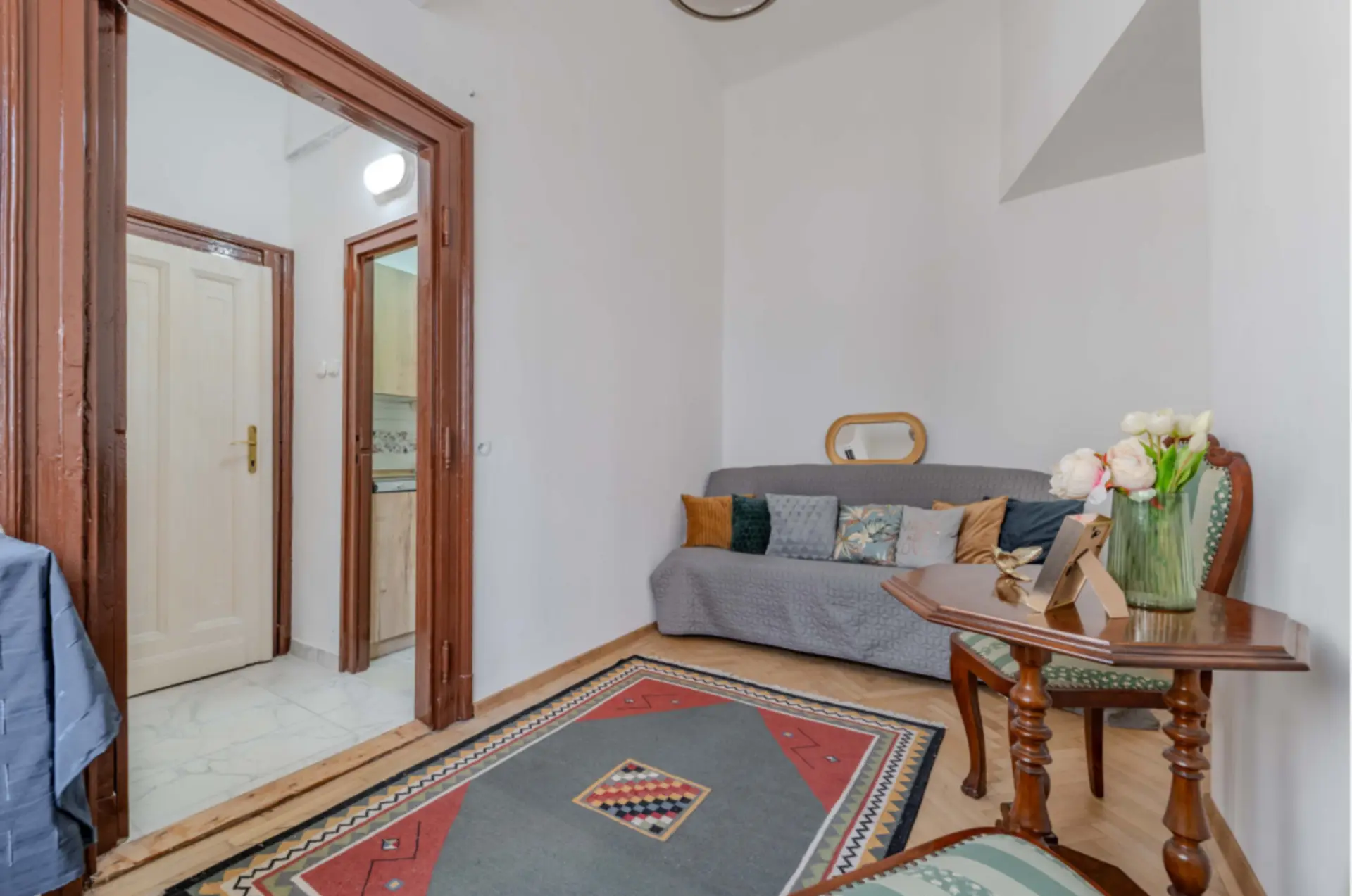 In 1051 Budapest, im Herzen des 5. Bezirks, steht ein straßenseitig gelegenes Studio‑Apartment mit ca. 15 m² zum Verkauf. Das Apartment befindet sich im 4. Stock eines eleganten, historischen Gebäudes mit Aufzug in der Október utca.