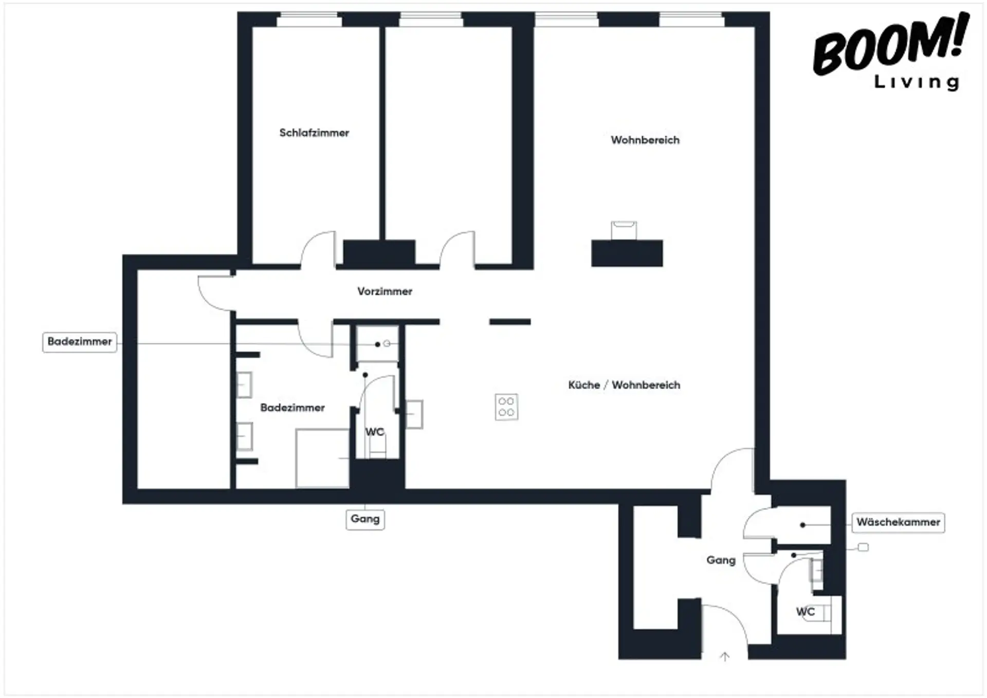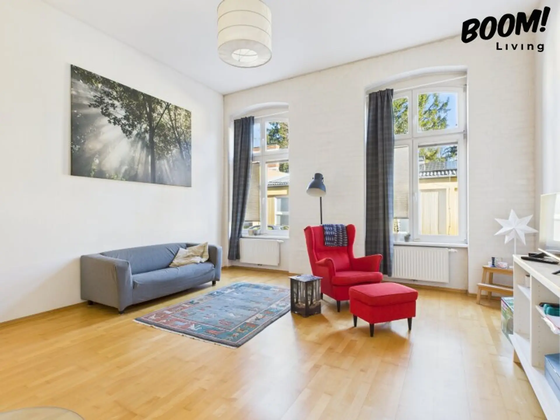 Die Wohnung verfügt über zwei Schlafzimmer, ein großes Badezimmer mit Dusche und Badewanne, eine separate Toilette, einen begehbaren Schrank/Abstellraum, einen Waschraum sowie zusätzliche Stauraumflächen. Der offene Wohnbereich ist durch den Kaminofen elegant zoniert und bietet viel Platz für modernes Familienleben.