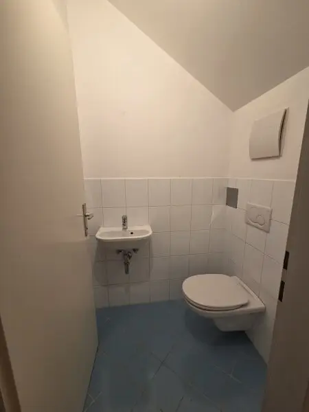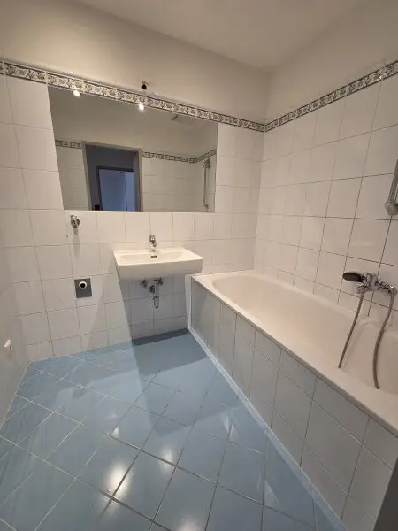 - Badezimmer mit Wannenbad, Handwaschbecken, Waschmaschinenanschluss, das WC ist getrennt angeordnet