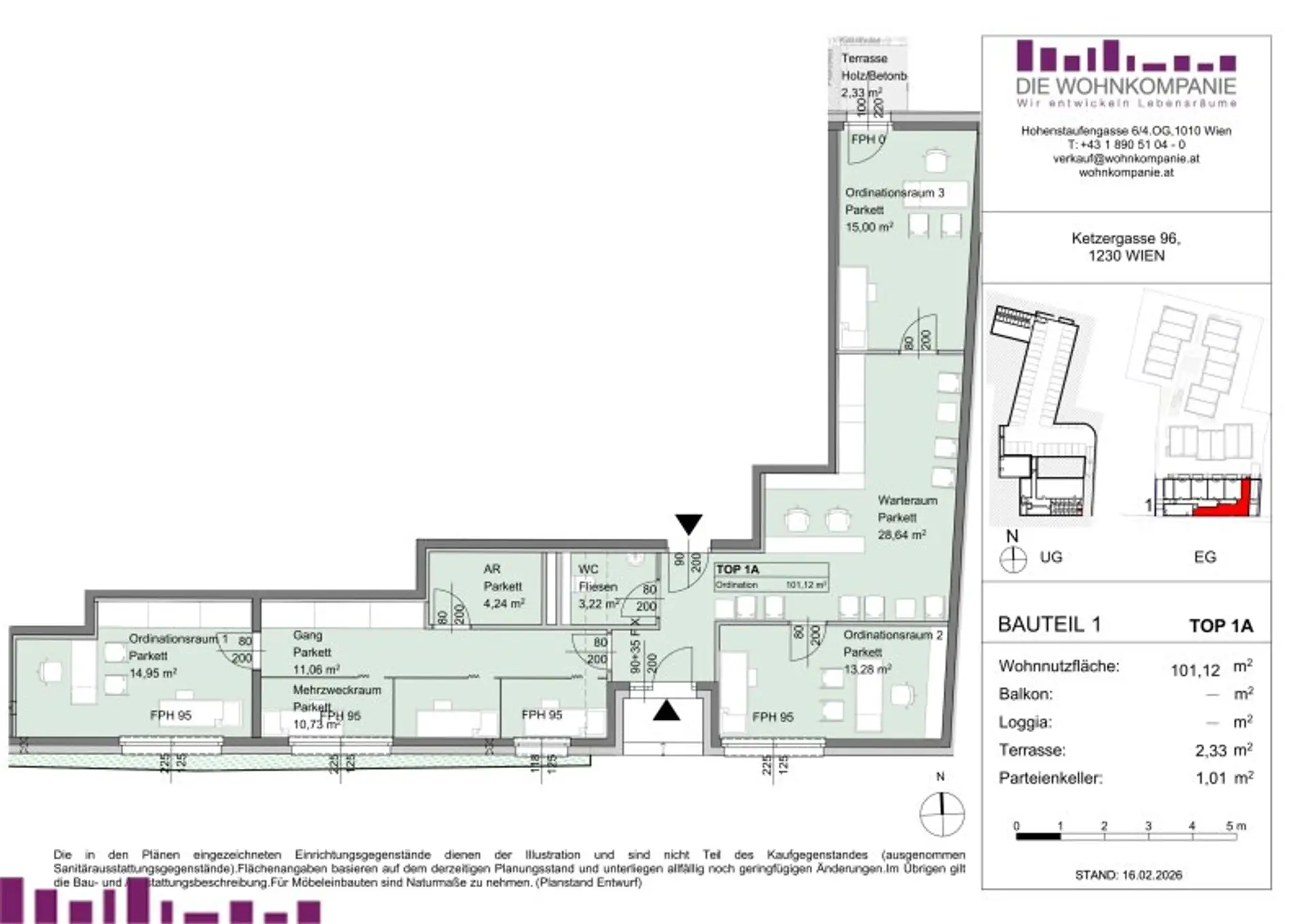 Die im Erdgeschoss gelegene Einheit überzeugt mit einer großzügigen Fläche von ca. 101,12 m² und einem besonders durchdachten Grundriss, der ideal auf den Betrieb einer Ordination oder Praxis abgestimmt ist.