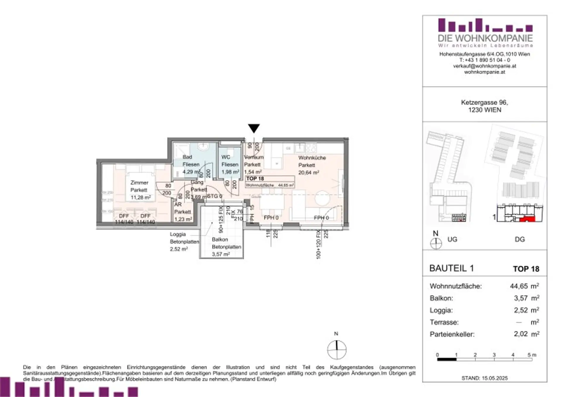 Die Wohnung verfügt zudem über einen Balkon mit ca. 3,57 m², eine Loggia mit ca. 2,52 m² sowie ein Kellerabteil mit ca. 2,02 m².