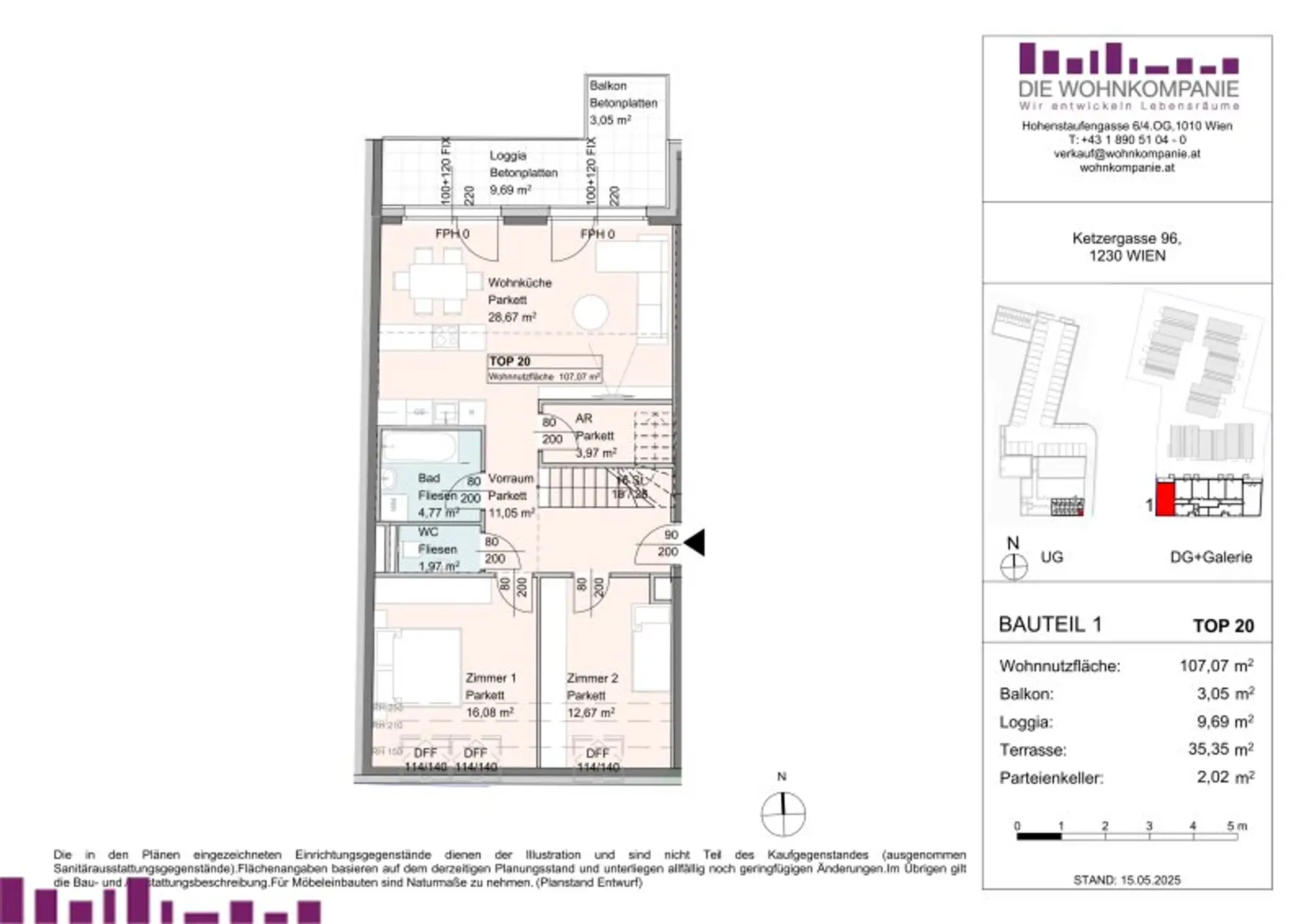 Die Wohnung verfügt zudem über einen Balkon mit ca. 3,05 m², eine Loggia mit ca. 9,69 m², eine Dachterrasse mit ca. 35,35 m² sowie ein Kellerabteil mit ca. 2,02 m².