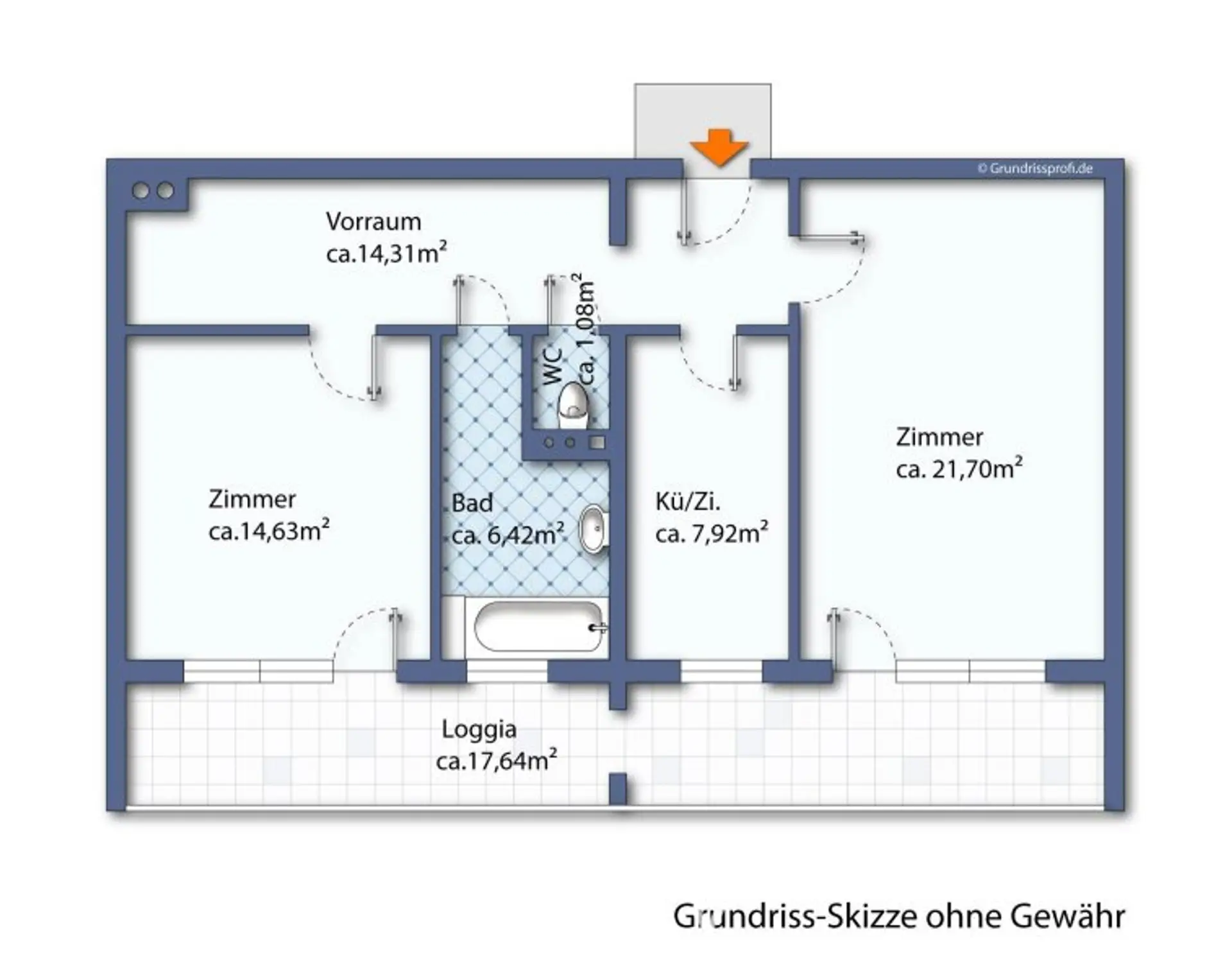 Die angegebene Größe von ca.83,70m² ist inklusive der Loggia mit ca.17,64m².