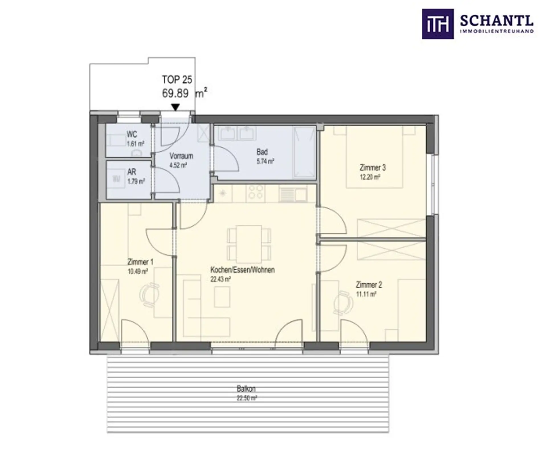 • 69,89 m² Wohnfläche + 22,50 m² sonnenverwöhnter Südbalkon