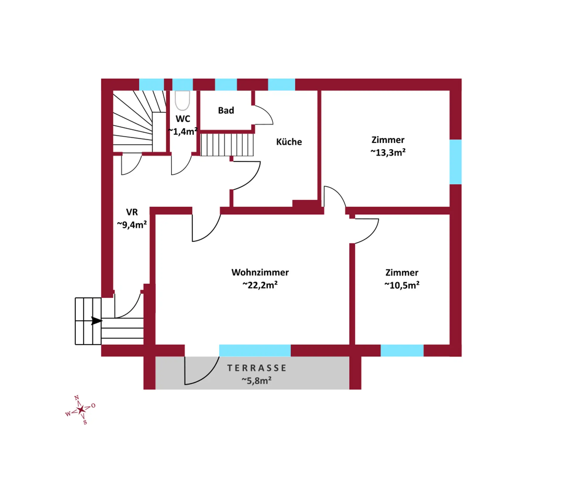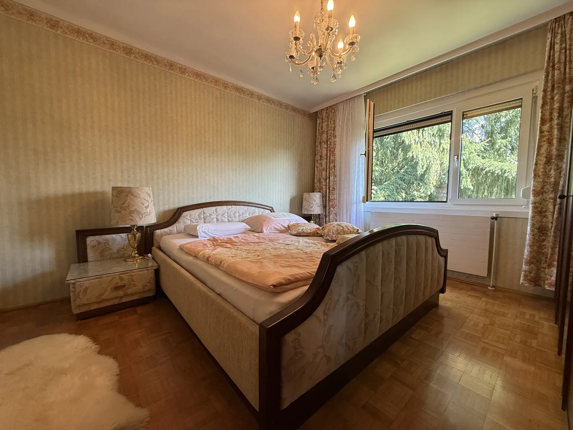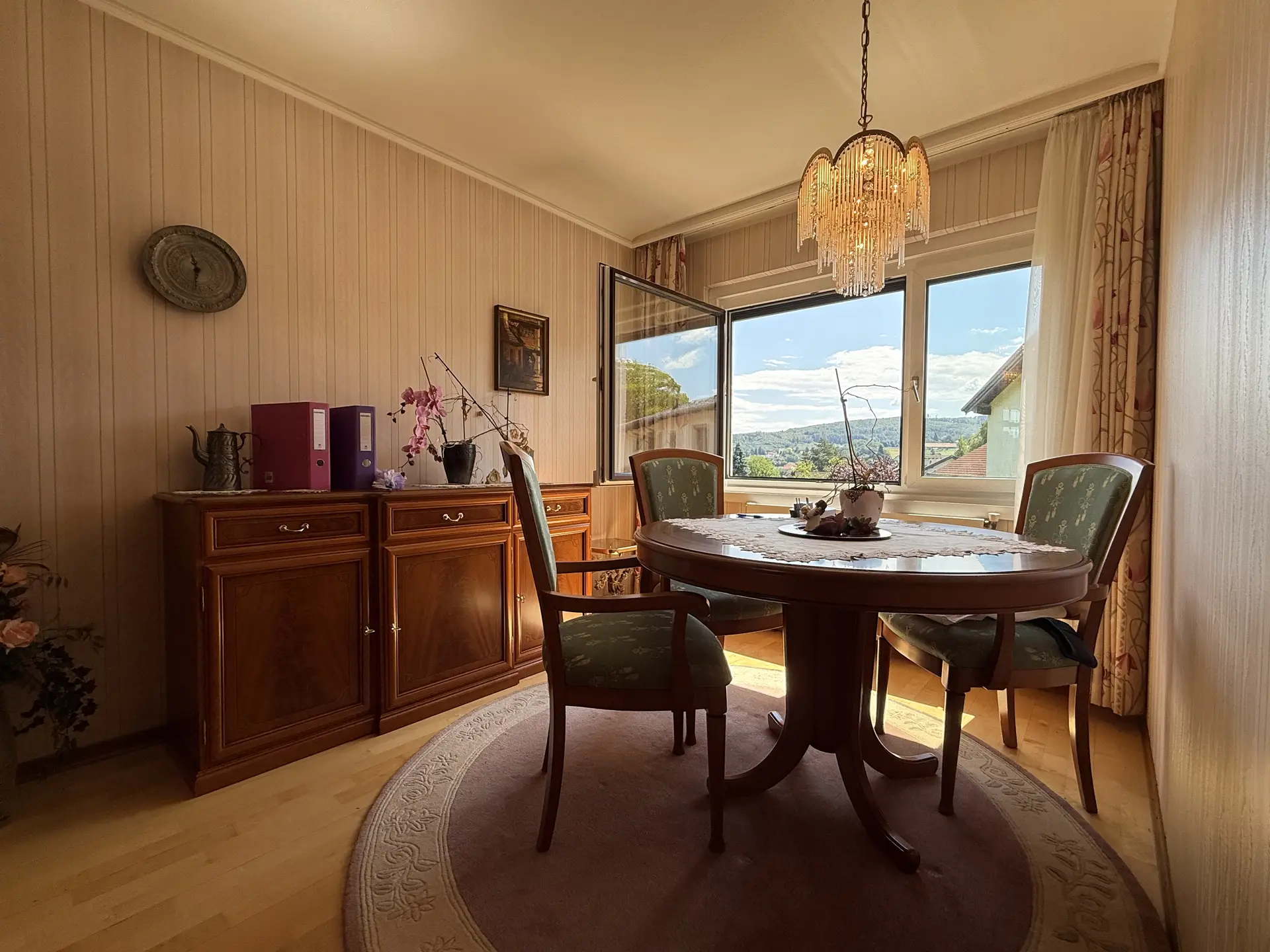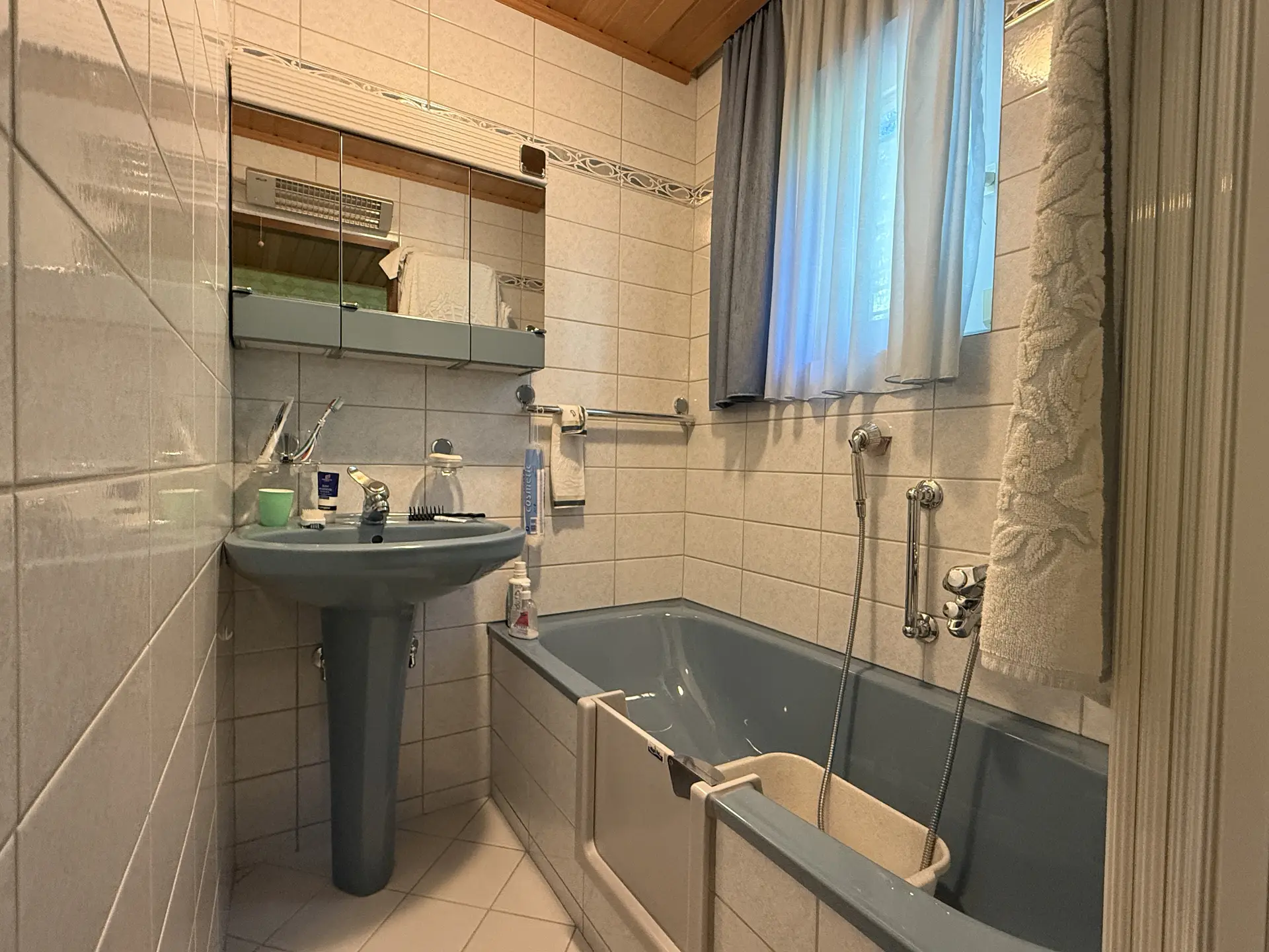 Im Erdgeschoss erwarten Sie ein helles Wohnzimmer mit direktem Zugang zur südwestlich ausgerichteten Terrasse , von der sich ein schöner Weitblick ins Grüne eröffnet. Ergänzt wird die Ebene durch eine Küche, zwei weitere Zimmer, ein Bad mit Fenster sowie ein separat zugängliches WC.