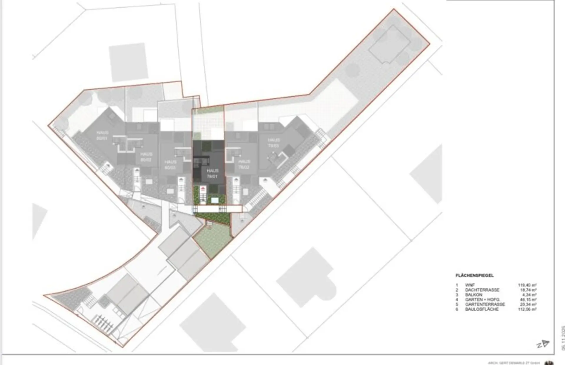WNF: 119,40 m², Dachterrasse: 18,74 m², Gartenterrasse: 20,34 m² Garten + Hofgarten: 46,15 m²