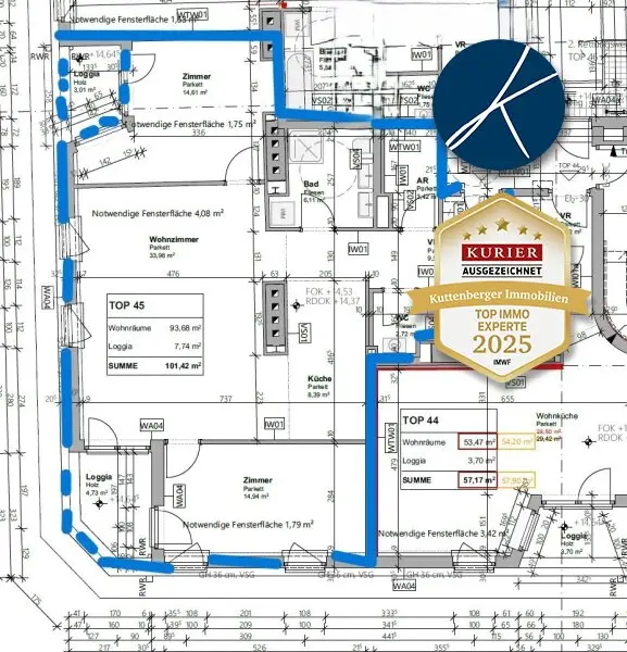 * Top 45 (4.Liftstock): 4 Zimmer / 93,68 m² Wohnfläche + 3,01 m² Loggia 1 + 4,73 m² Loggia 2 - Gesamtmiete € 2229,-