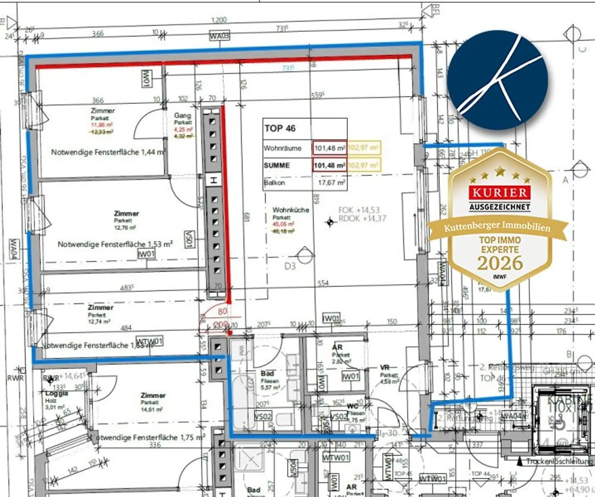 * Top 46 (4.Liftstock): 4 Zimmer / 101,48 m² Wohnfläche + 17,67 m² Balkon - Kaufpreis € 609.000,-