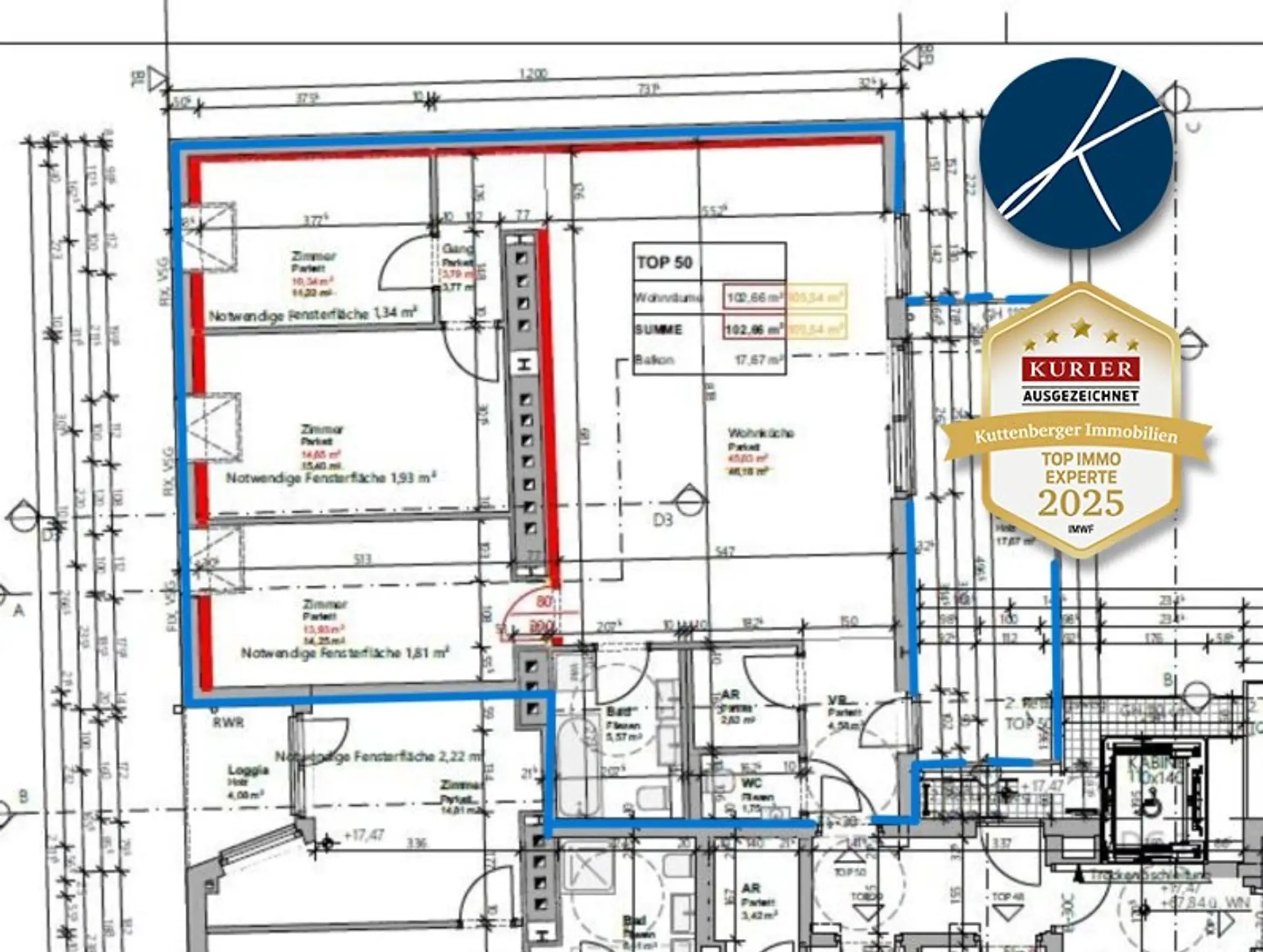 * Top 50 (1.DG): 4 Zimmer / 102,66 m² Wohnfläche + 17,67 m² Balkon - Gesamtmiete € 2329,-