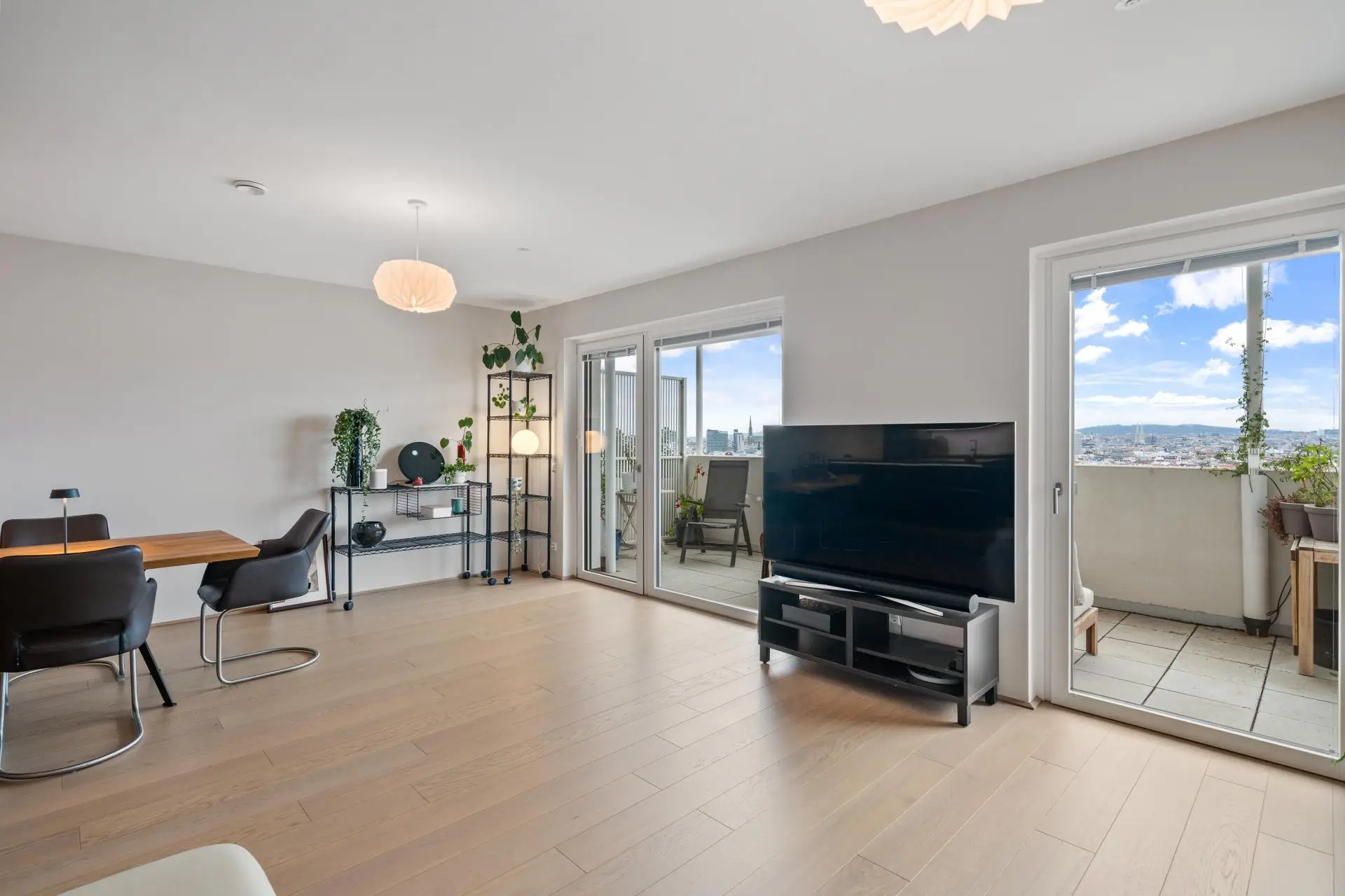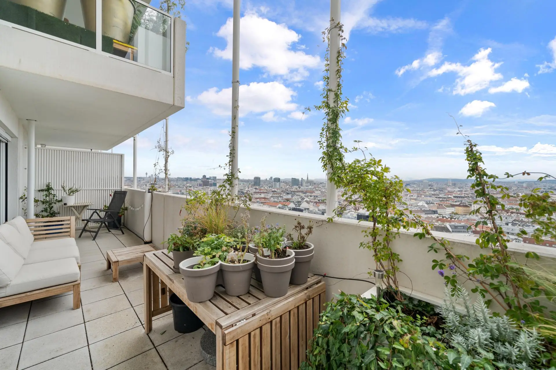 Vom Wohnzimmer und einem der Zimmer gelangt man direkt auf den ca. 20 m² großen Balkon mit einem traumhaften 180 Grad Rundumblick über Wien.