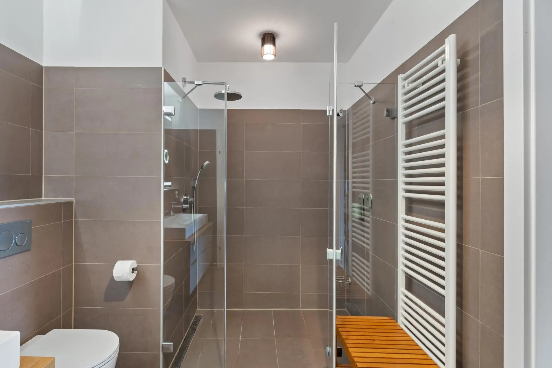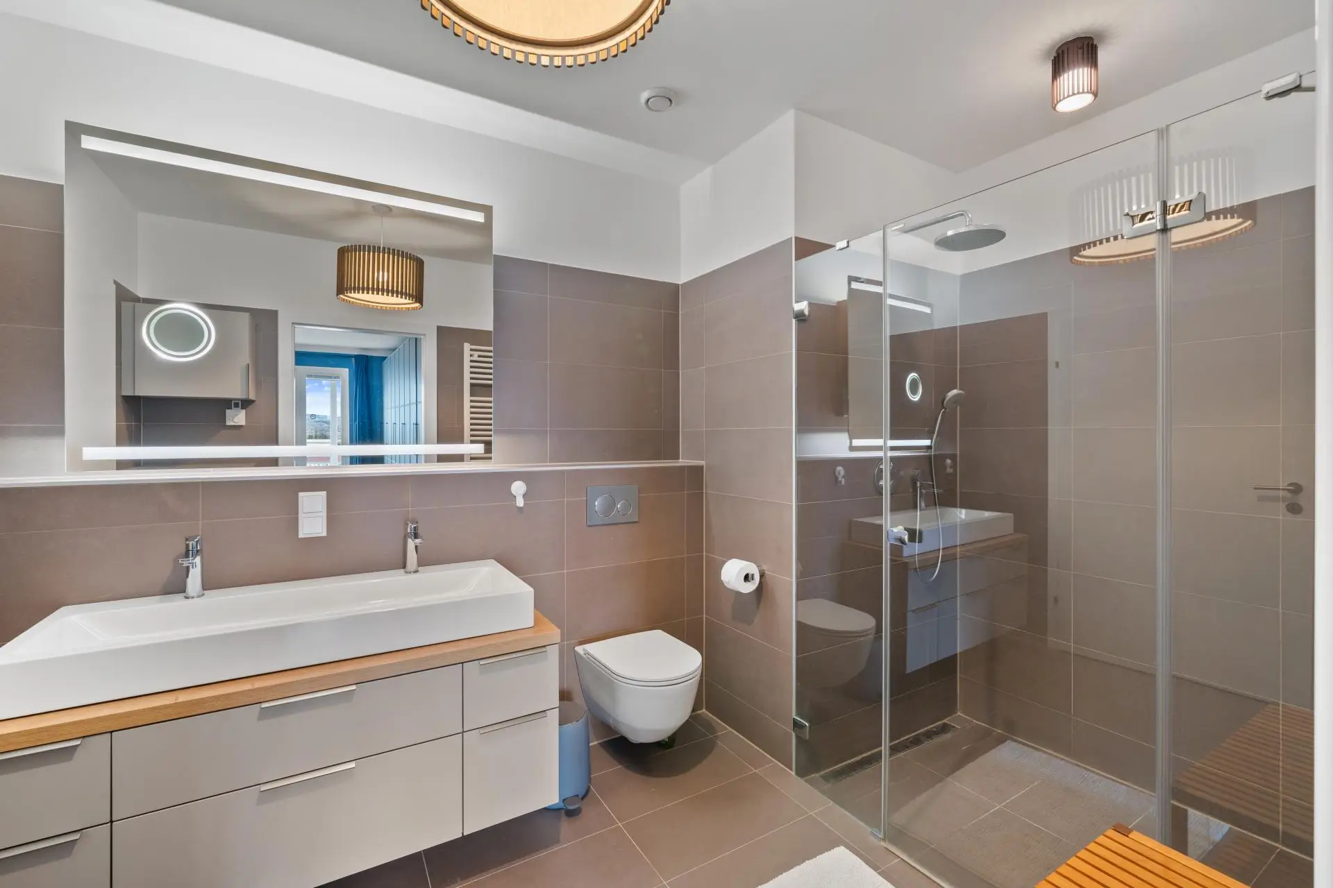 Vom zweiten Schlafzimmer, dem Masterbedroom ist noch ein Badezimmer mit bodenebener Dusche, WC und Doppelwaschtisch erreichbar. Von diesem Badezimmer erreicht man auch einen kleinen Hauswirtschaftsraum der Platz für Waschmaschine und Trockner bietet.