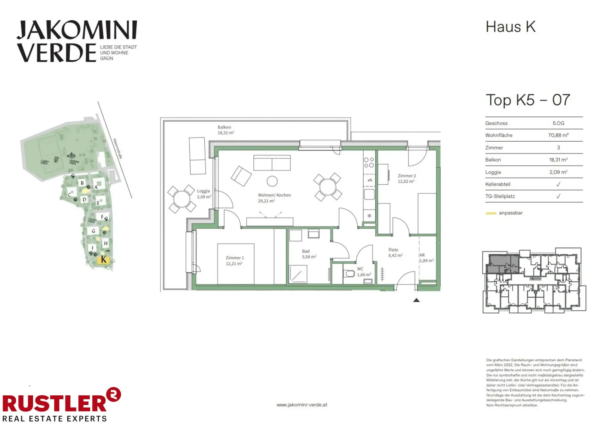 TAG DER OFFENEN TÜR am Sonntag, 19.10.2025 von 10:00-16:00 Uhr - Kommen Sie vorbei! Sonderaktion - 6 Monate betriebskostenfrei wohnen! JAKOMINI VERDE - PROVISIONSFREI Modern, hochwertig, nachhaltig - Ihr neues Zuhause im Graz-Jakomini! Entdecken Sie Ihre Traumwohnung im Wohnungsfinder! Jakomini Verde ist ein modernes und nachhaltiges Wohnprojekt im Herzen von Graz, das urbanes Leben mit einer grünen, ruhigen Umgebung vereint. Das gesamte Quartier setzt auf nachhaltige Bauweise und umweltfreundliche Energieversorgung. Durch eine Wasser/Wasser-Wärmepumpe wird das Gebäude effizient beheizt. Zusätzlich wird Fernwärme zur Warmwasserbereitung genutzt, wodurch die Wohneinheiten in den kalten Monaten optimal beheizt und in den heißen Sommermonaten angenehm temperiert werden. Highlights - Moderne Architektur – Lichtdurchflutete Räume, bodentiefe Fenster - Freiflächen für jede Wohnung – Balkon oder Loggia inklusive - Hochwertige Ausstattung – Parkett, Fußbodenheizung, 3-fach-Verglasung - Nachhaltiges Energiekonzept – Wärmepumpe, Fernwärme, PV-Anlage (Mieterstrommodell) - Top-Infrastruktur – Öffis, Einkaufsmöglichkeiten, Naherholung in direkter Nähe - Fahrradfreundlich – direkte Anbindung an das Radwegenetz - Komfort & Barrierefreiheit – Lift, stufenloser Zugang, Tiefgarage verfügbar Wohnungsbeschreibung: Die Top K5-07 ist ca. 70,88 m² groß, befindet sich im 3. Stock und hat folgende Räumlichkeiten: - Vorraum - Wohnküche - 2 Schlafzimmer - Badezimmer mit Dusche - separates WC - Balkon - Kellerabteil - Tiefgaragenplatz (optional) Lage und Infrastruktur: Die Lage von Jakomini Verde könnte nicht besser sein: Die Mur und der Augartenpark mit dem Augartenbad liegen praktisch vor der Tür und bieten zahlreiche Freizeitmöglichkeiten. Der Jakominiplatz ist schnell erreichbar und auch diverse Einkaufsmöglichkeiten sowie Restaurants und Cafés liegen in der Umgebung. Das Quartier ist perfekt in das Radwegenetz der Stadt eingebunden, wodurch umweltfreundliche Mobilität einfach und schnell möglich ist. Hier verbinden sich urbanes Leben und Natur zu einem idealen Zuhause. Beziehbar: ab sofort Überzeugen Sie sich im Zuge einer Besichtigung!