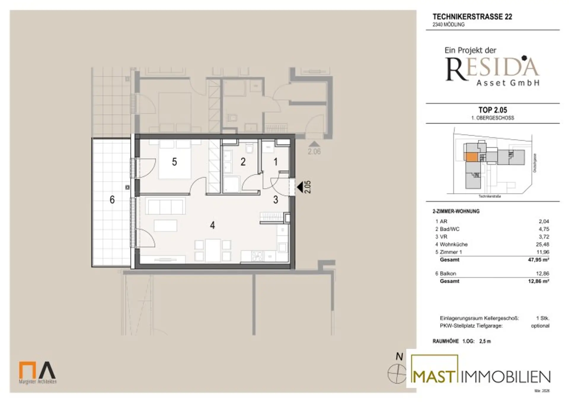 Die Wohnung befindet sich im 1. OG und verfügt über 47,95 m² Wohnfläche + einen 12,86 m² großen Balkon.