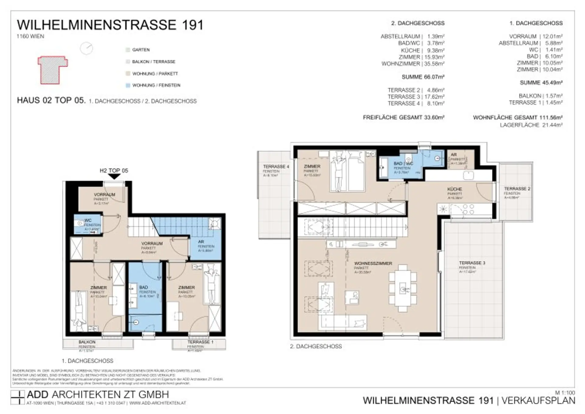 Die sich über das 1. Und 2. Dachgeschoss erstreckende Maisonettwohnung beeindruckt mit insgesamt 5 Terrassen. Jedes Zimmer ist mit einer eigenen kleinen Terrasse ausgestattet. Von der Hauptterrasse aus liegt einem Wien zu Füßen. Außerdem verfügt die Wohnung über:
