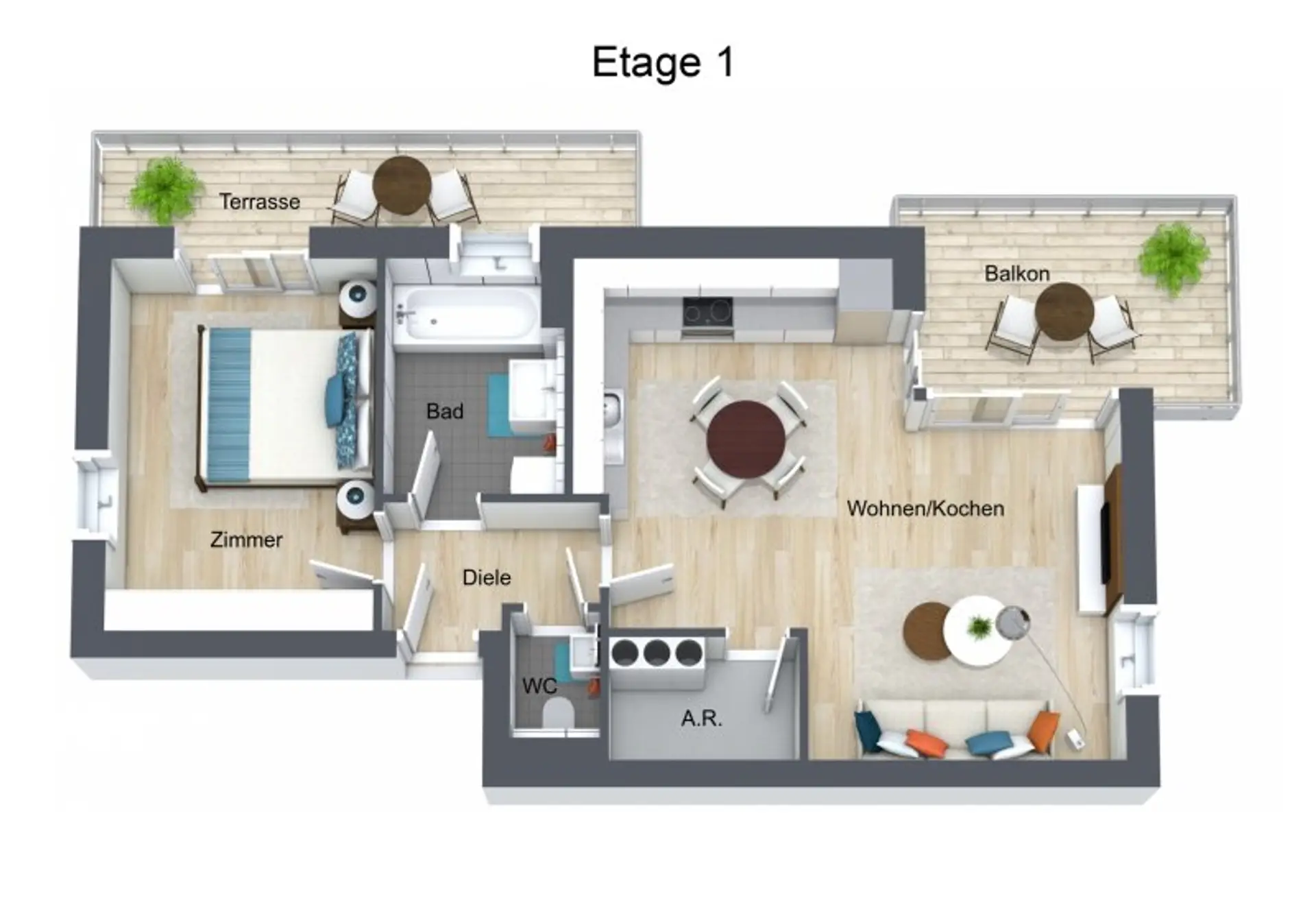 - großer Wohn- bzw. Ess- Kochbereich mit Zugang auf die große Terrasse