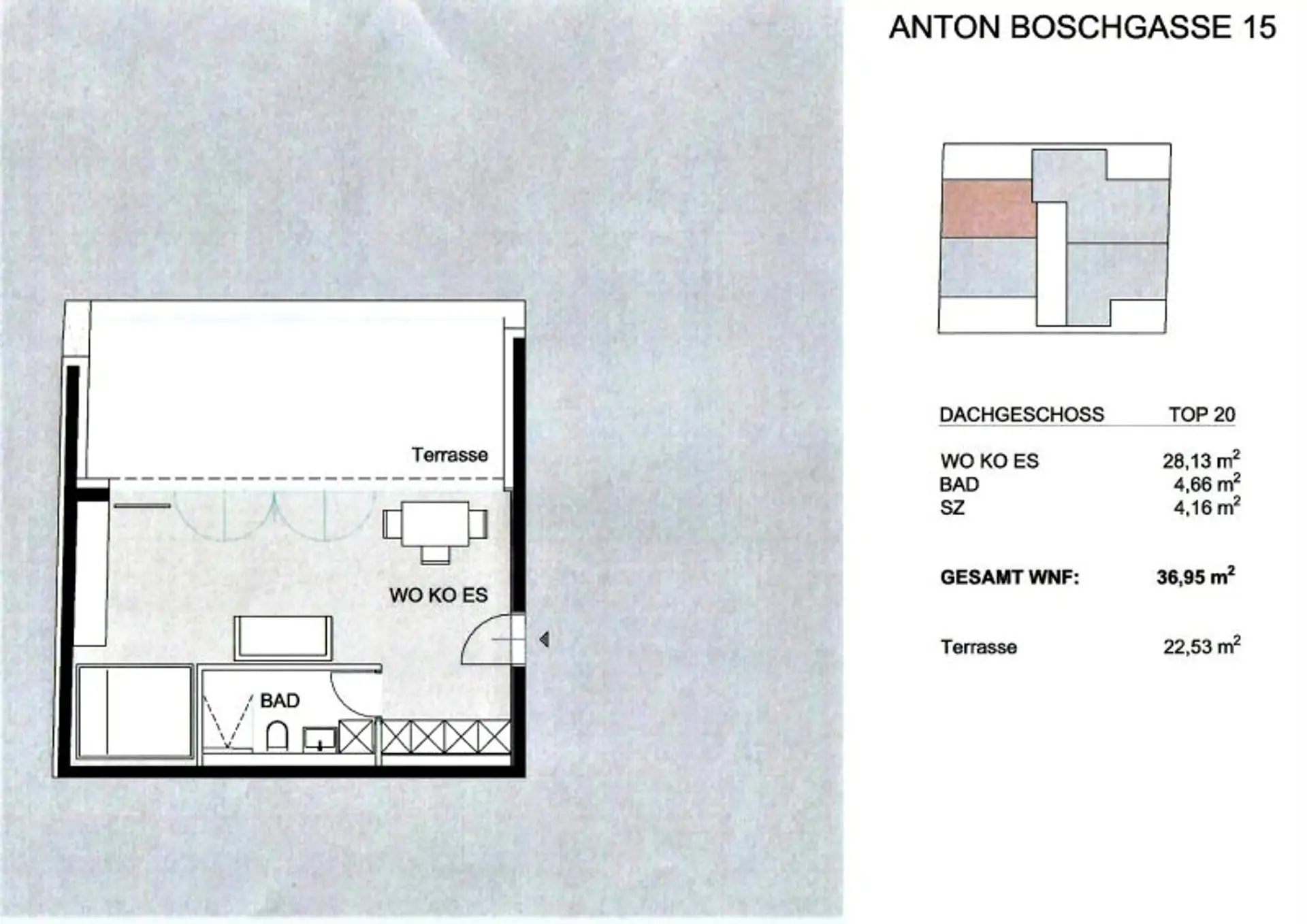 IN DER ANTON-BOSCH-GASSE GELANGT DIESE 36,95 M2 NEUBAUWOHNUNG MIT CA. 22,53 M2 TERRASSE IM DACHGESCHOSS ZUR BEFRISTETEN VERMIETUNG!