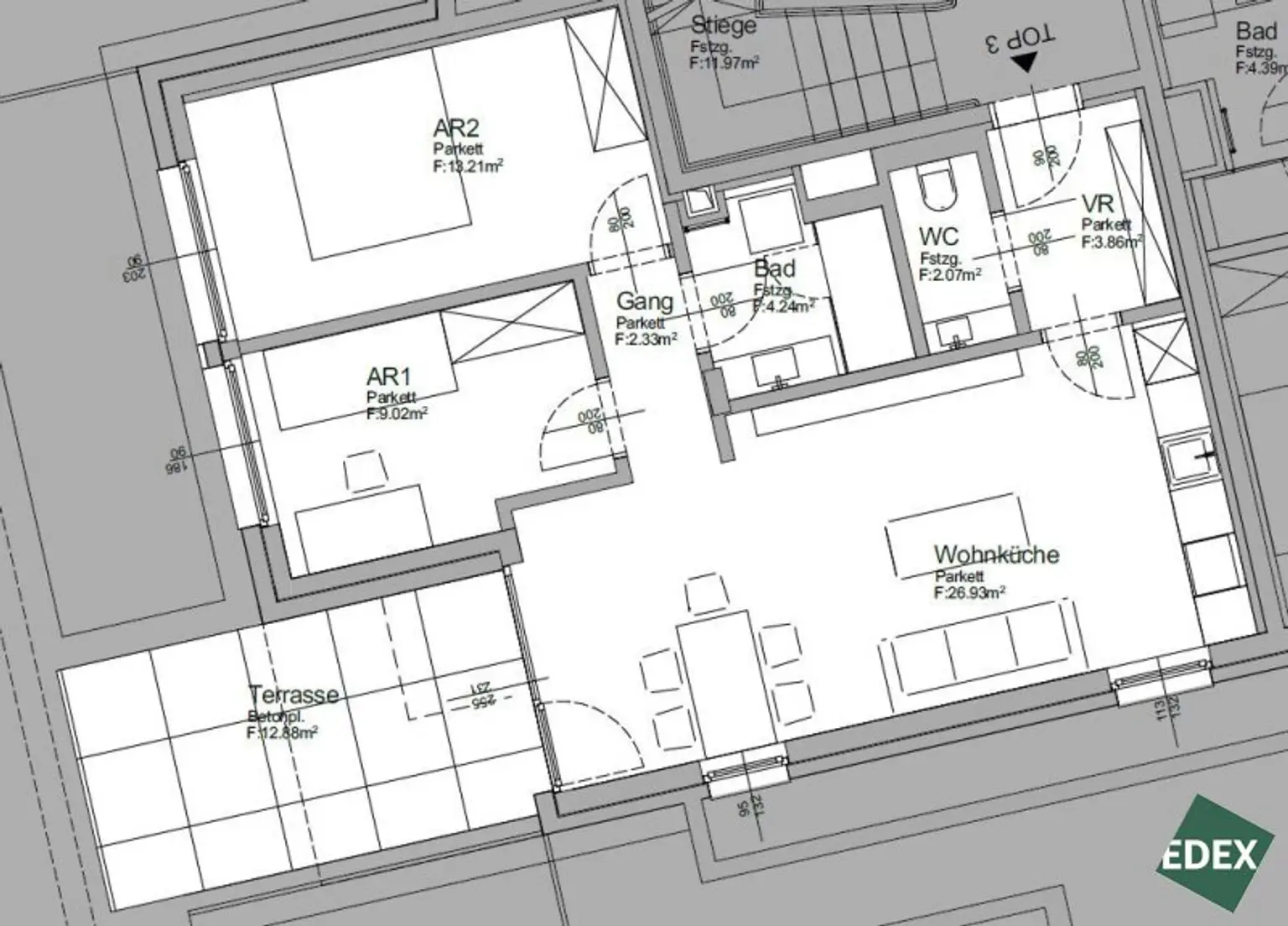 Die Wohnungen mit einer Größe von ca. 48 m² bis 137 m² verfügen über ein bis drei Zimmer und bieten großzügige Grundrisse mit durchdachter Raumaufteilung. Beinahe jede Einheit verfügt über eine Freifläche in Form von Balkon, Terrasse oder Garten – für mehr Licht, Luft und Lebensqualität. Die intelligente Raumnutzung vermittelt selbst bei kleineren Flächen Großzügigkeit. Der zentrale Wohnbereich mit offener Küche (ausgestattet mit modernen SIEMENS-Geräten) schafft einen harmonischen Mittelpunkt für entspanntes Wohnen.