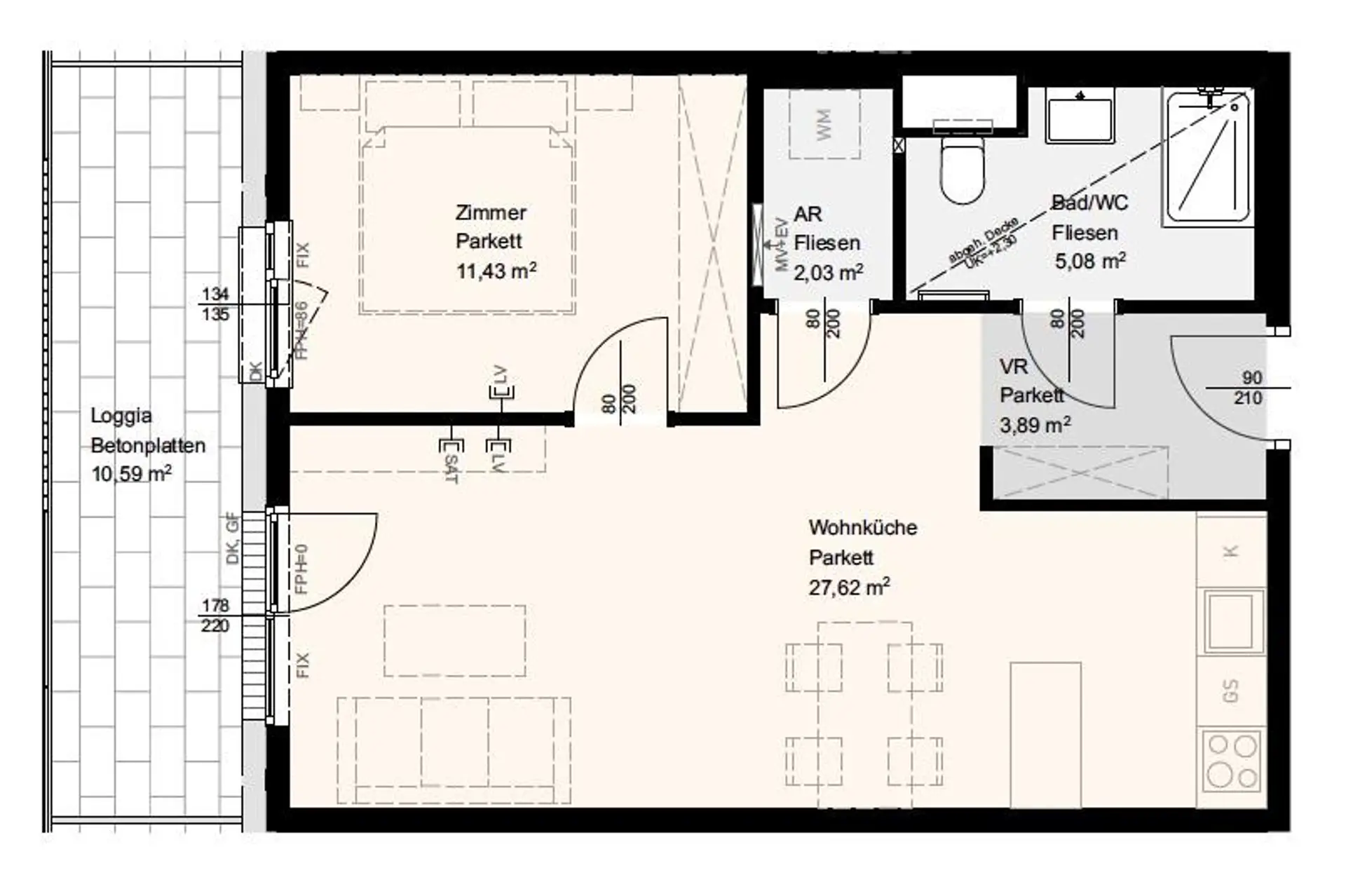 • Deckenkühlung (passive Kühlung im Sommer durch die Betondecke) und Heizung (thermische Heizdecke, per Fernwärme)