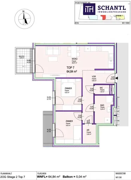 Wohnfläche: ca. 64,84 m² + Balkon: ca. 5,04 m² + Kellerabteil