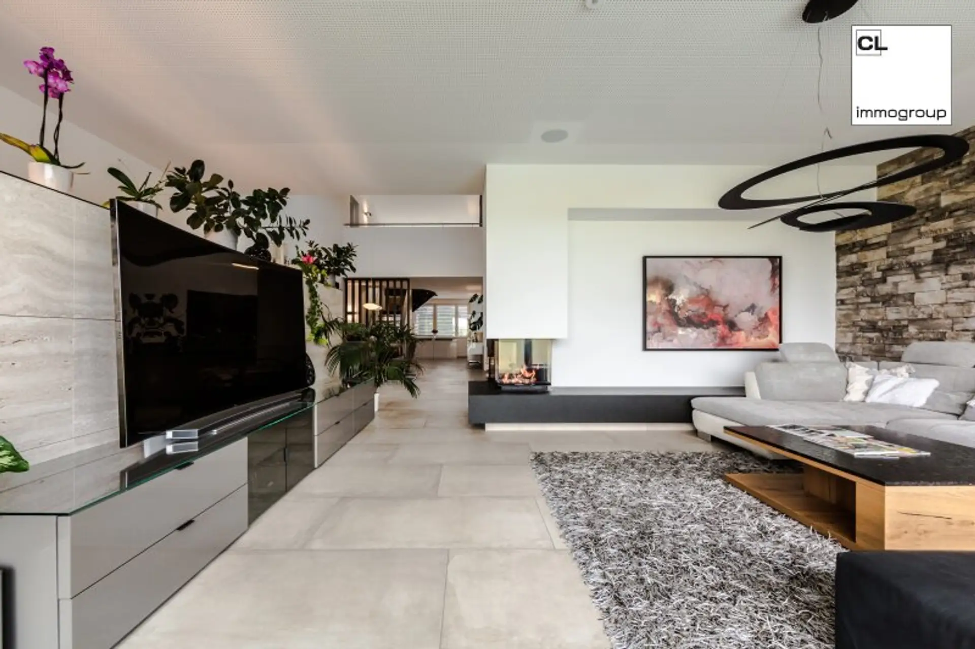 Schon beim Betreten beeindruckt das großzügige Entrée und führt in den elegant gestalteten Wohn- und Essbereich. Mehrere stilvolle Aufenthaltszonen mit Kaminfeuer, der gemauerte Pizza-Backofen und der freie Blick ins Grüne schaffen ein Ambiente, das Wärme und Großzügigkeit perfekt verbindet.