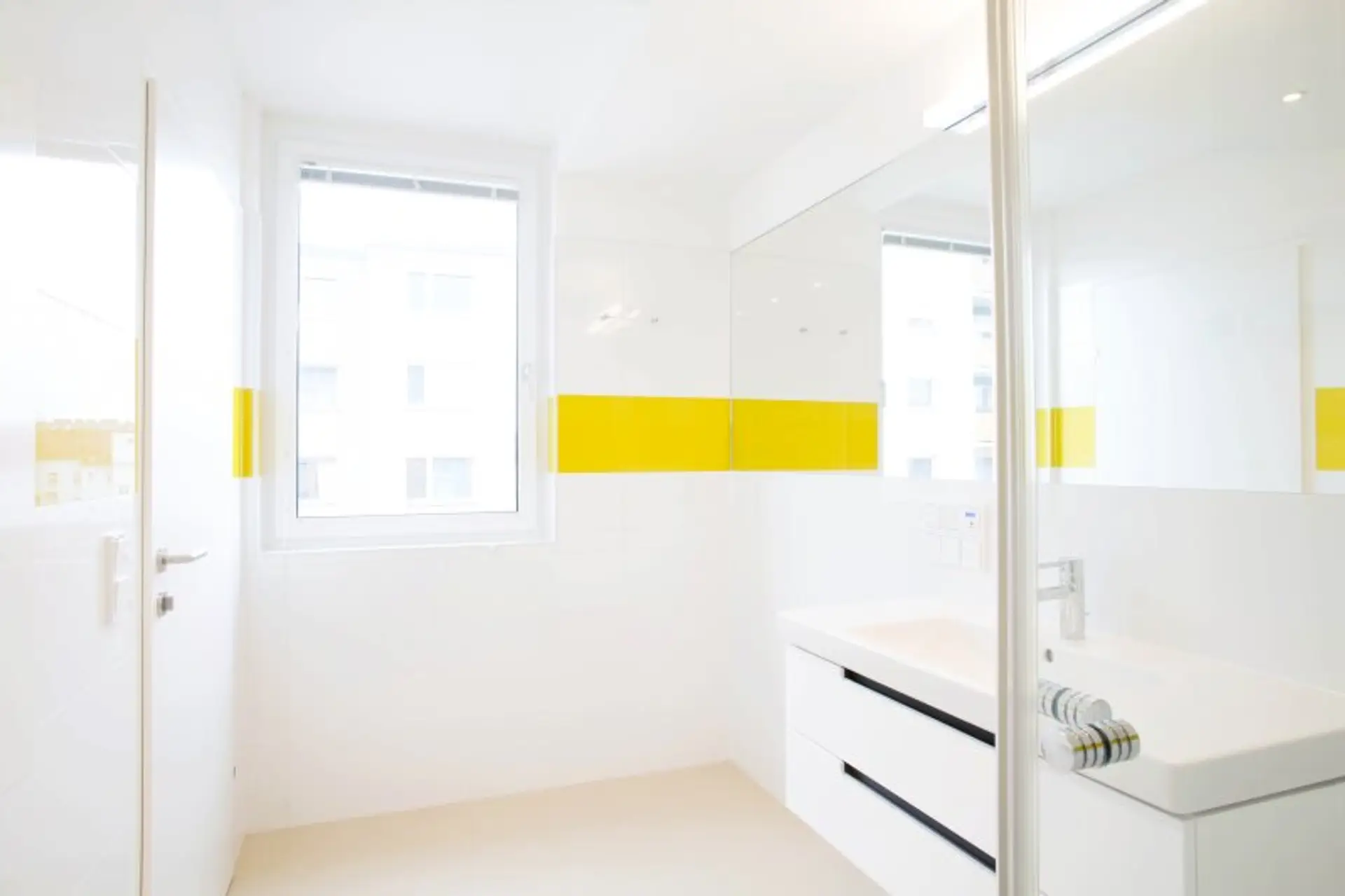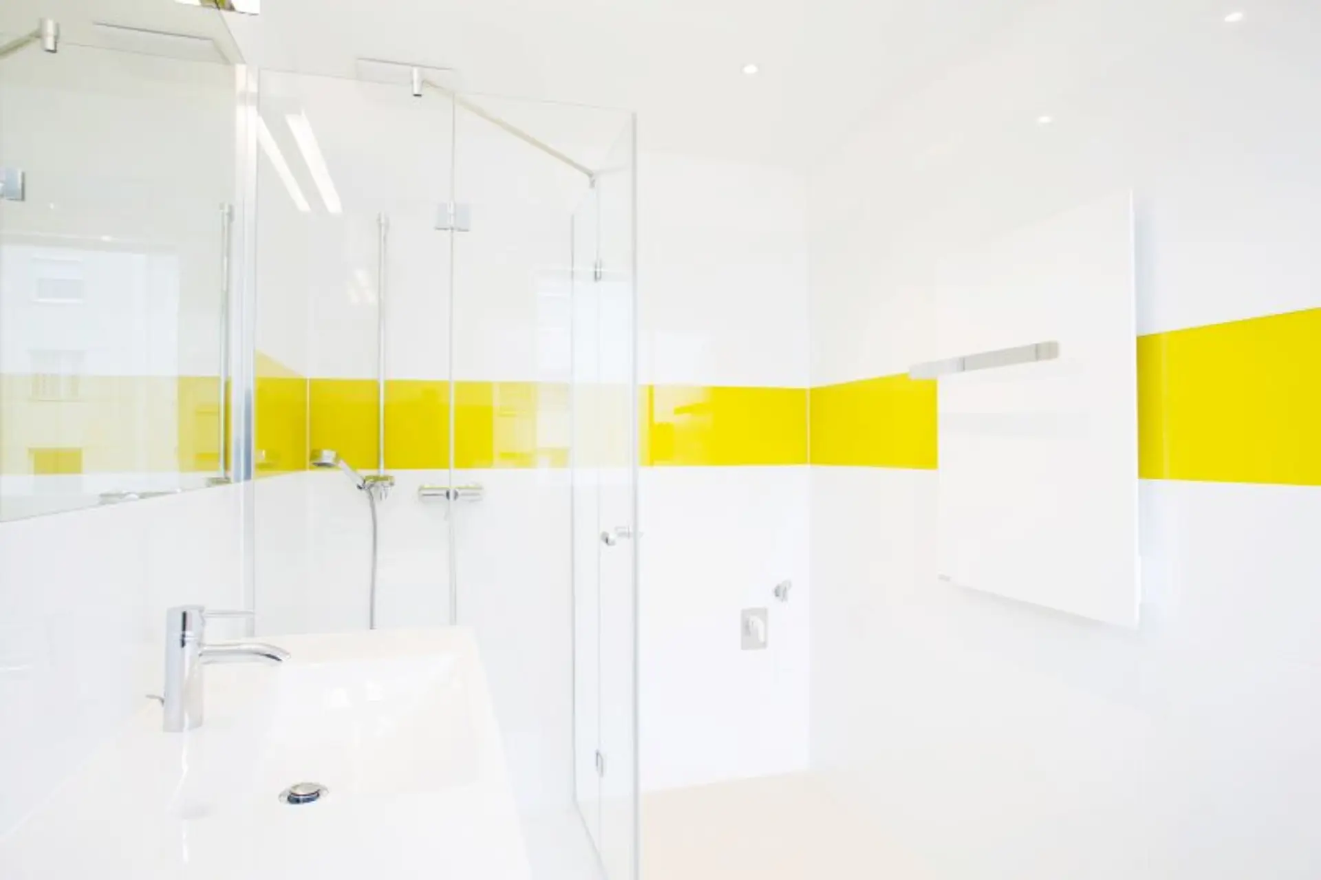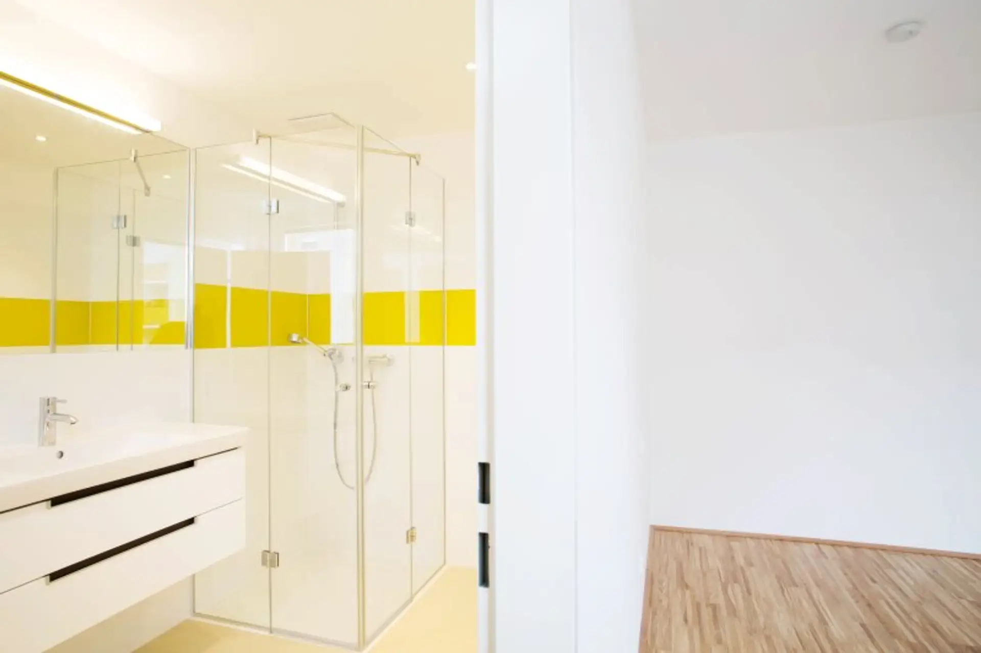 * Badezimmer mit Dusche, Waschmaschinenanschluss und Handtuchtrockner