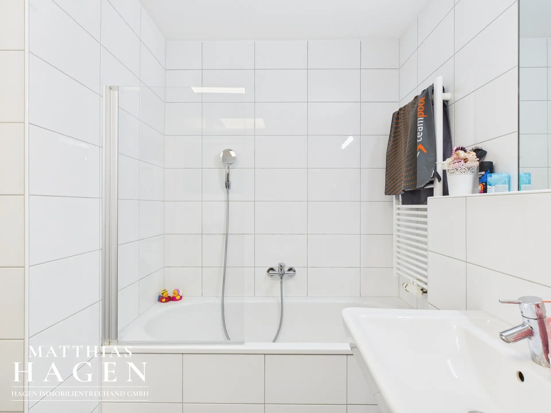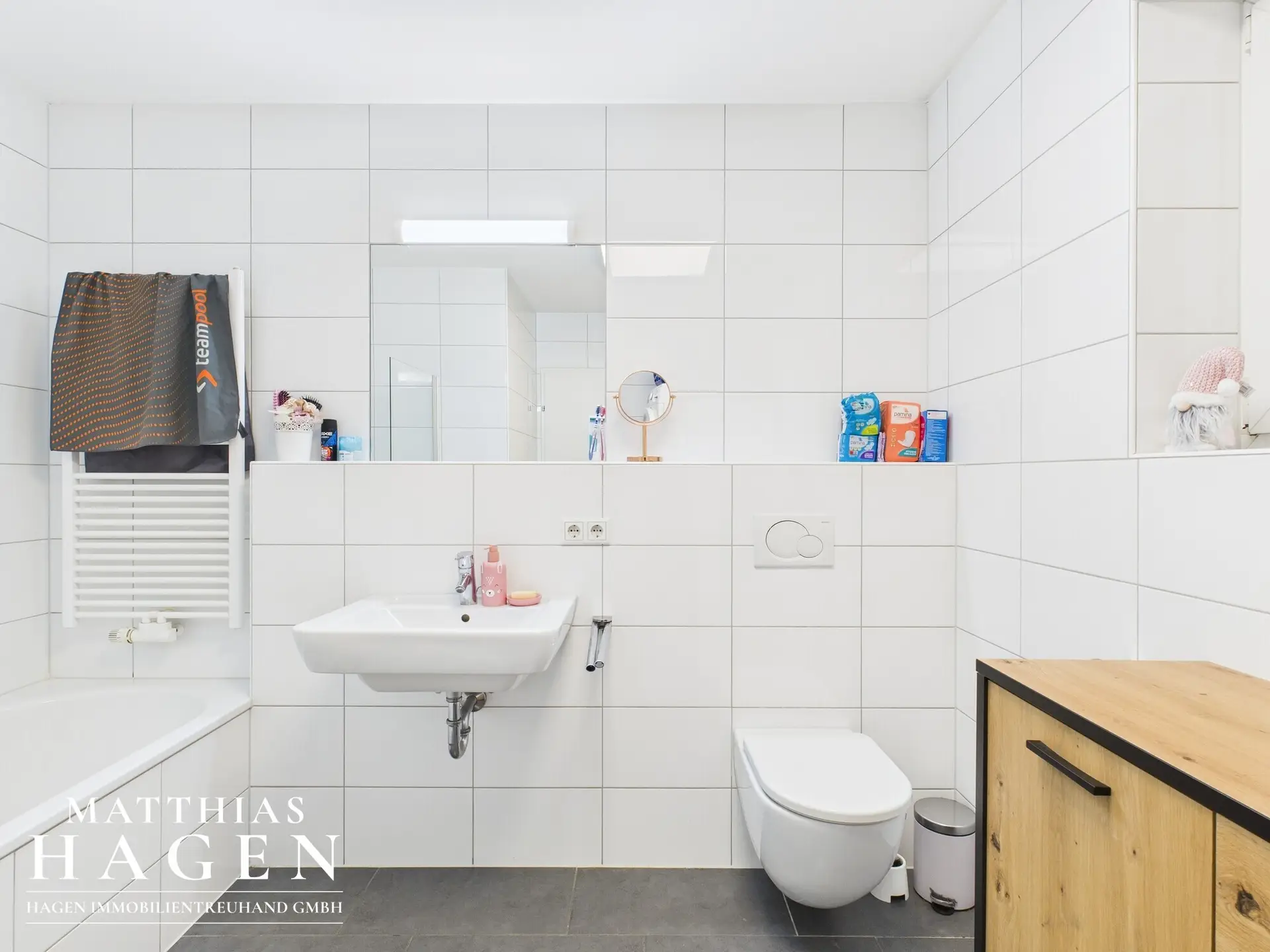 Das Badezimmer ist mit einer Badewanne und einem Fenster ausgestattet. Ein Tiefgaragenplatz ist im Kaufpreis bereits enthalten.