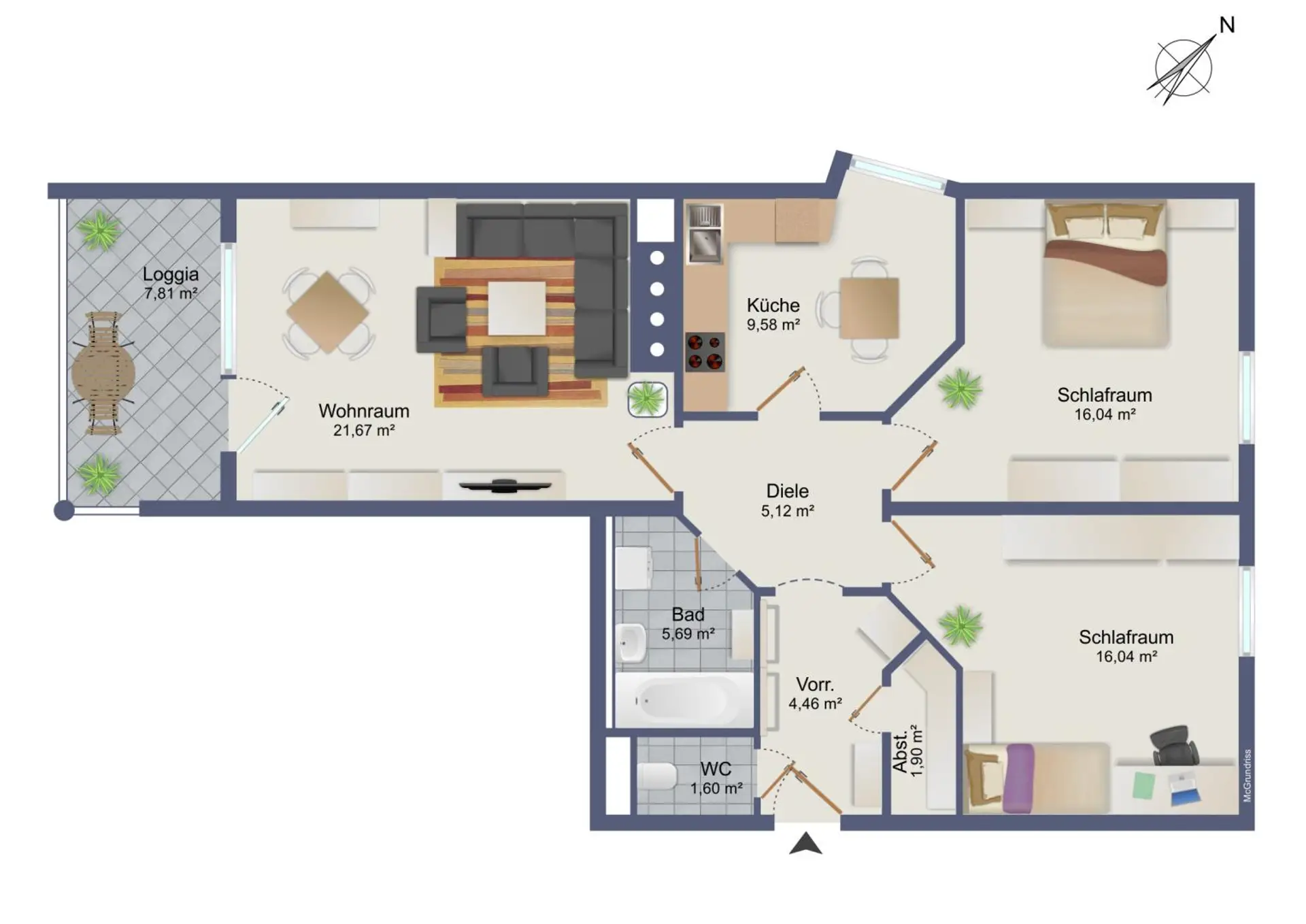 Die gemütliche Wohnung hat ca. 89 m² Wohnnutzfläche, befindet sich im Erdgeschoss und gliedert sich in: