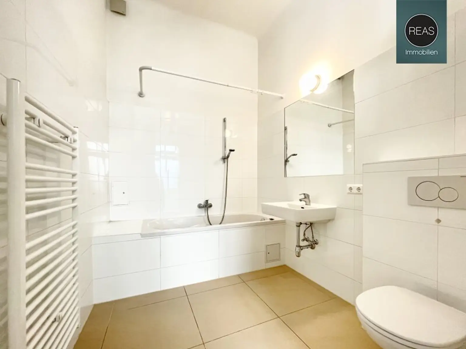 * 1 Badezimmer mit WC, Waschbecken samt Spiegel, Badewanne sowie einem Handtuchheizkörper