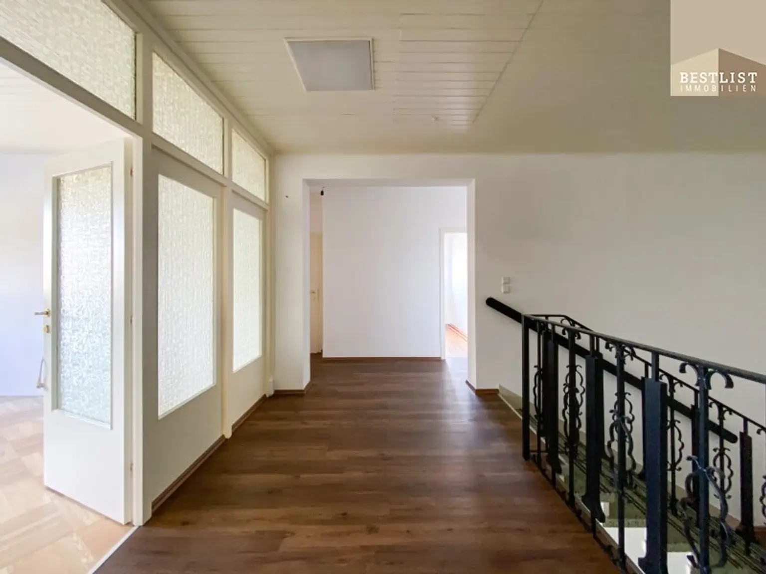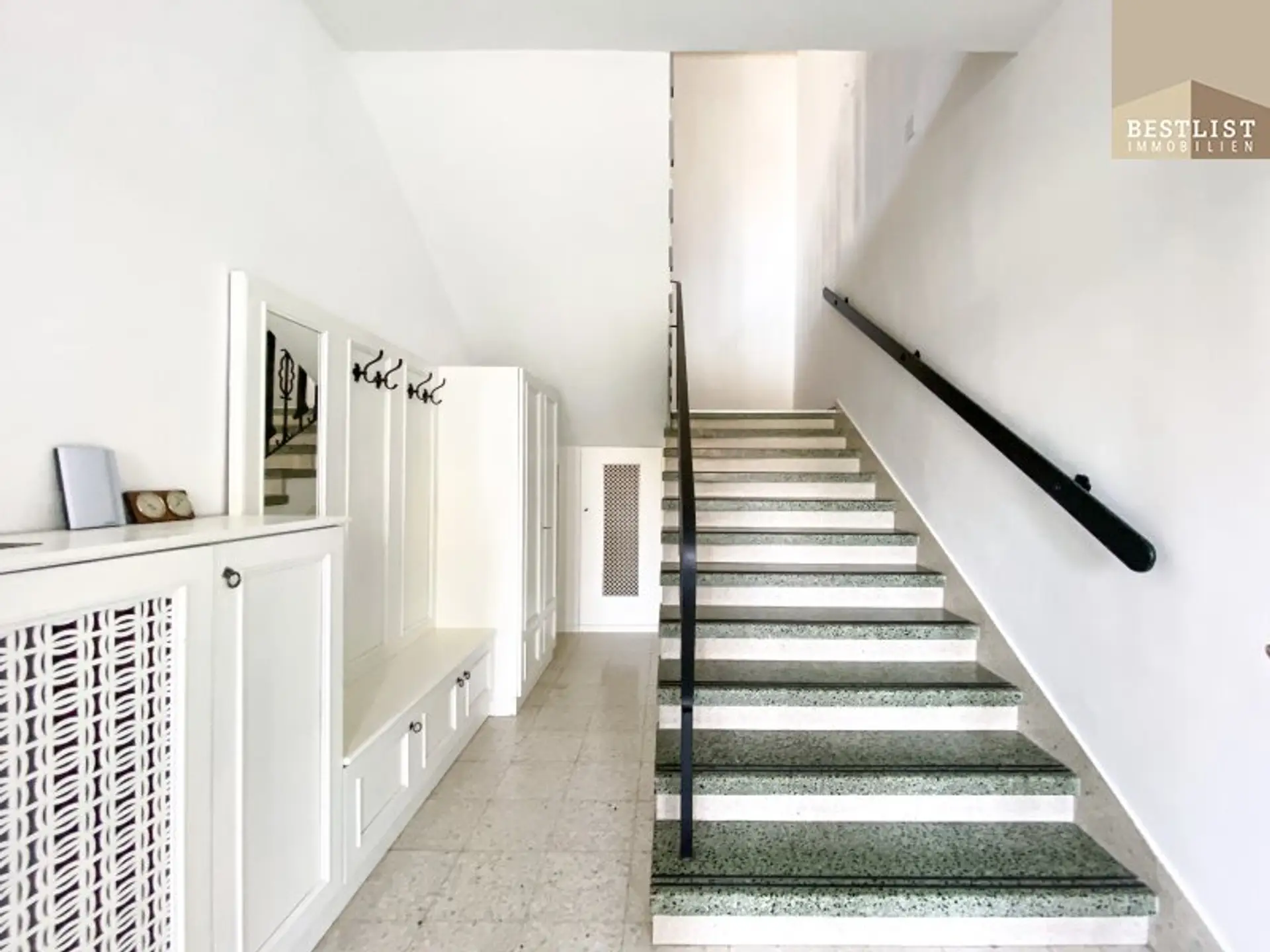 Öffnet man die Eingangstüre und betritt das Haus, gelangt man in den im Erdgeschoss gelegenen Eingangsbereich. Hier gibt es ausreichend Platz für eine große Garderobe. Über eine tolle Treppe gelangt man in das Obergeschoss.