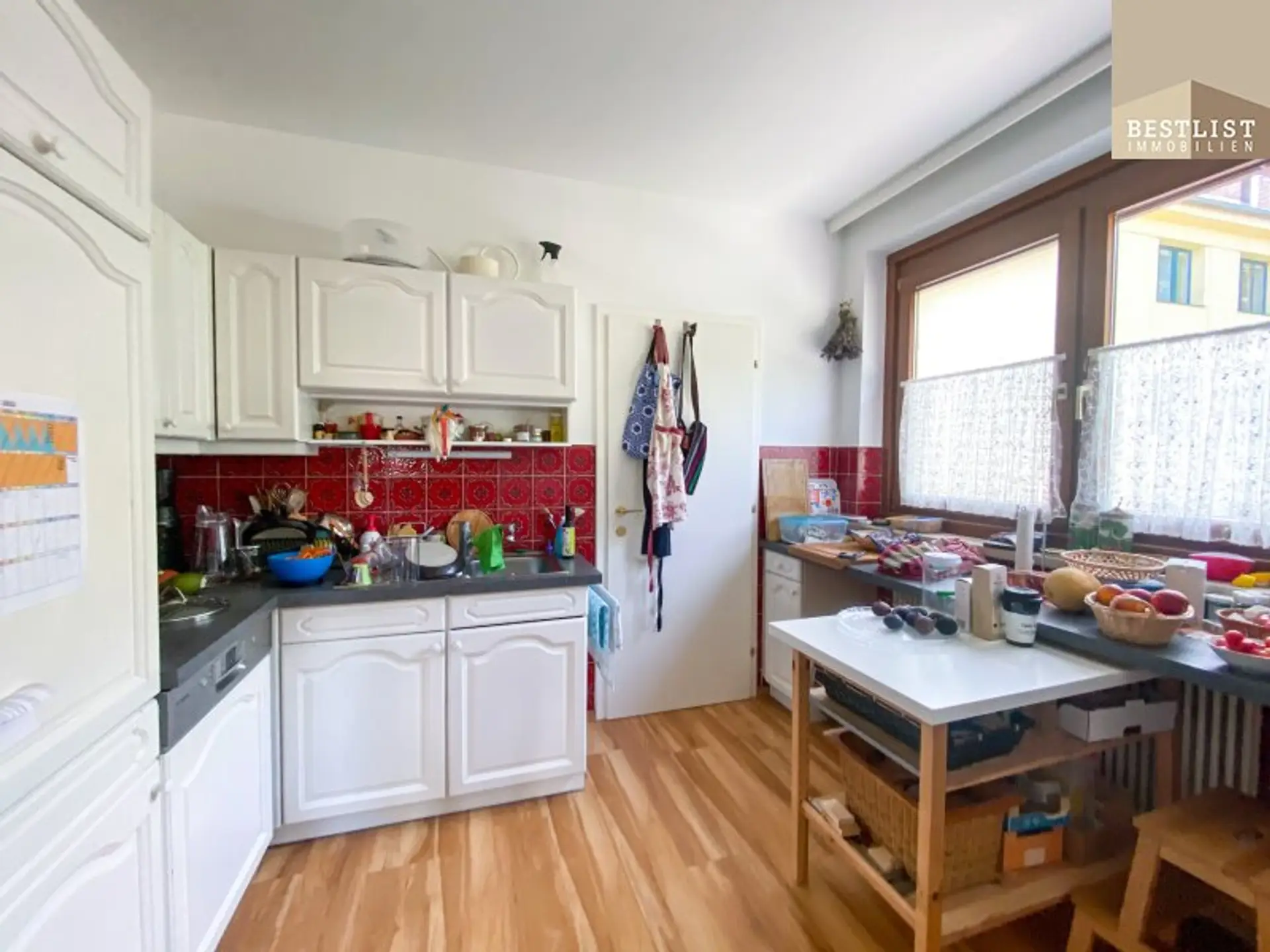 Das Obergeschoss verfügt über ein großes und helles Wohn-/Esszimmer, hier lässt sich problemlos sowohl die Esszimmereinrichtung als auch das komplette Wohnzimmermobiliar unterbringen und es bleibt immer noch genug angenehmer Freiraum. Neben dem Wohn-/Esszimmer befindet sich die schöne Landhausküche. Die Küche ist gut ausgestattet und lässt keine Wünsche offen. Dem Zubereiten von köstlichen Speisen steht hier Nichts mehr im Wege.