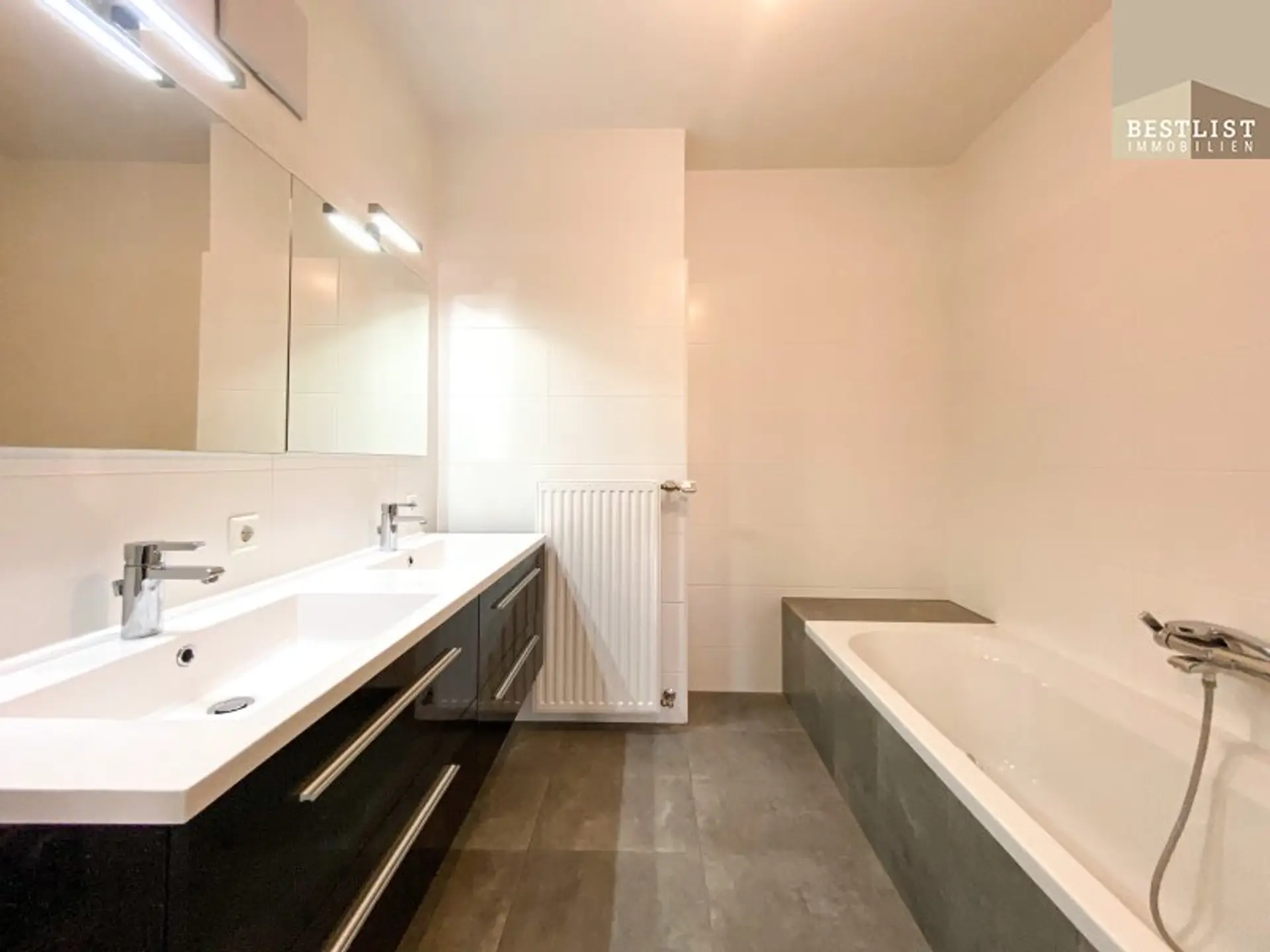 Das Badezimmer ist gut ausgestattet und verfügt über einen großen Waschtisch, eine Walk-In-Dusche und eine Badewanne. Das WC befindet sich separat.