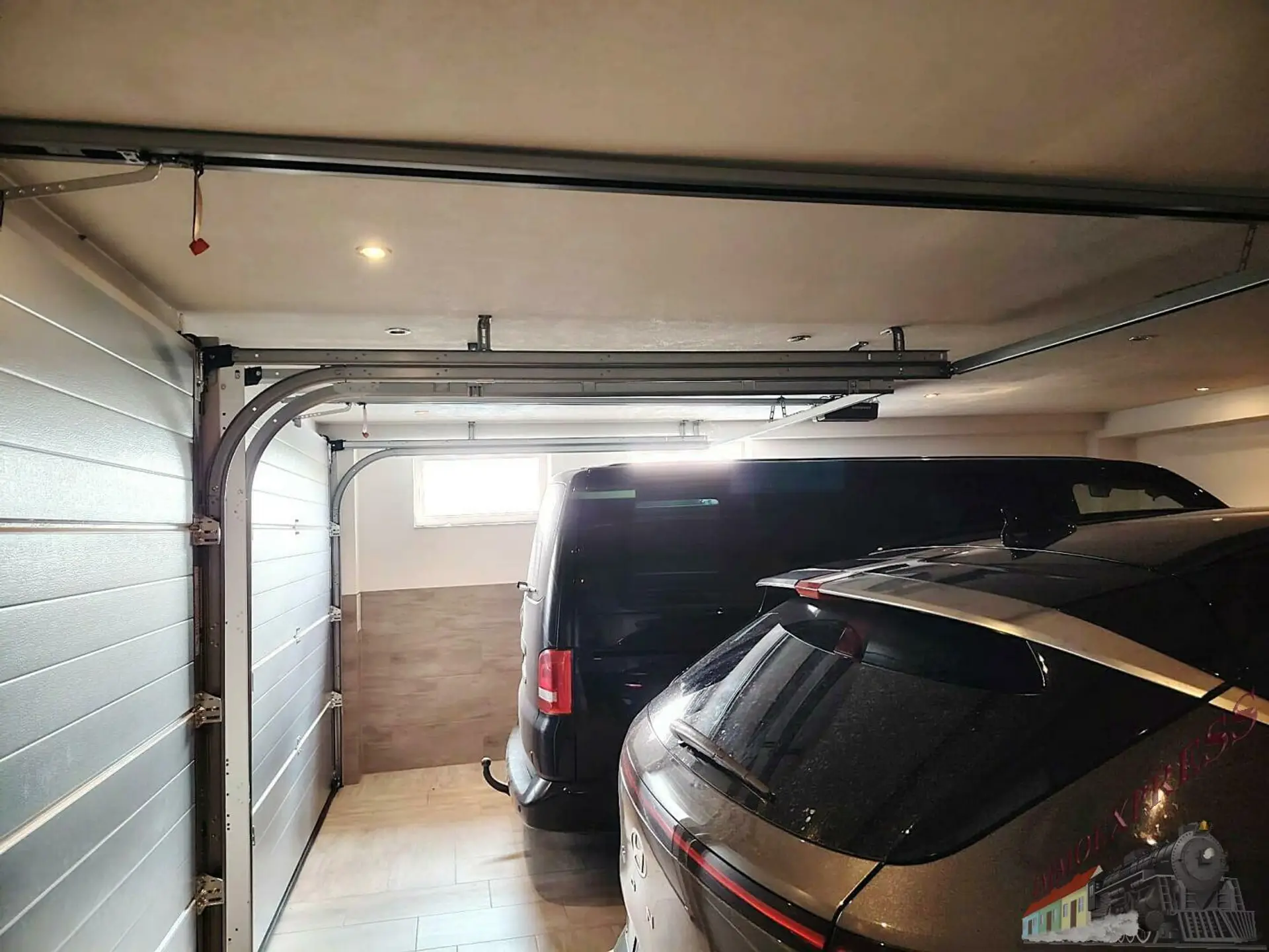 Zwei integrierte Garagenplätze bieten direkten, wettergeschützten Zugang ins Haus. Das Gebäude ist voll unterkellert, solide gebaut mit 38 cm starken Außenwänden und 10 cm Vollwärmeschutz. Für behagliche Wärme sorgen eine Ölzentralheizung und zwei Kachelöfen, einer davon im Keller.