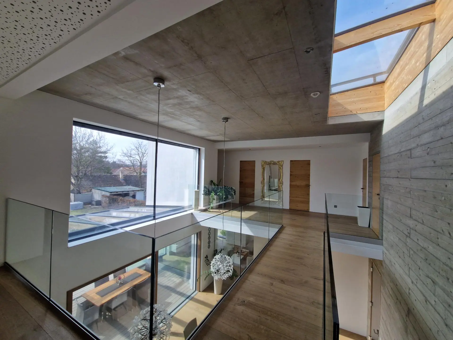 Stilvolle Stiegenanlagen führen in das Obergeschoss, hier werden Sie von einem atemberaubenden Galeriebereich mit viel Glas und toller Belichtung empfangen. Von hier aus sind alle Räumlichkeiten getrennt begehbar, ein Elternschlafzimmer, ein geschmackvolles Badezimmer mit Badewanne, großer Walk-In-Dusche und WC samt Doppelwaschtisch sowie zwei weitere, große Zimmer, welche bei Bedarf mit wenig Aufwand gut teilbar wären, vervollständigen das reichhaltige Platzangebot. Ein Zimmer wird derzeit als Schrankraum genutzt.