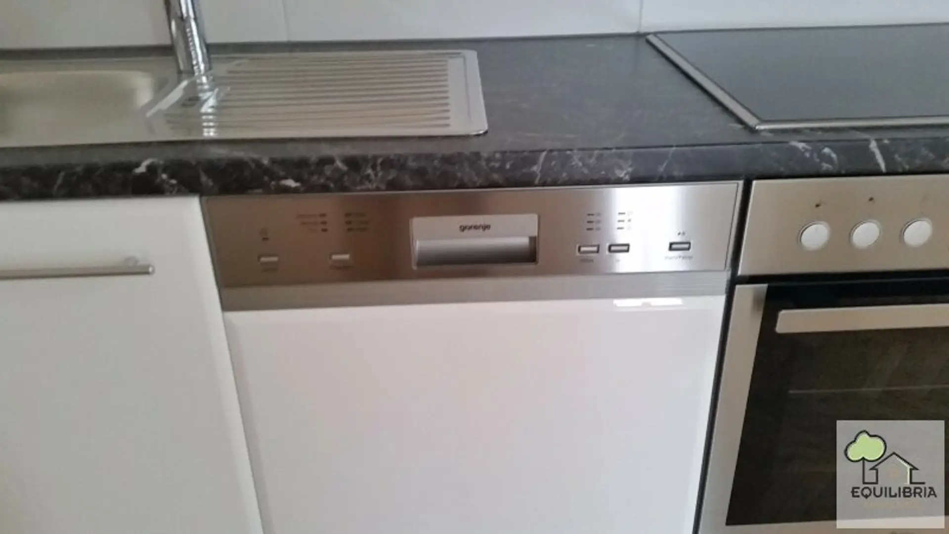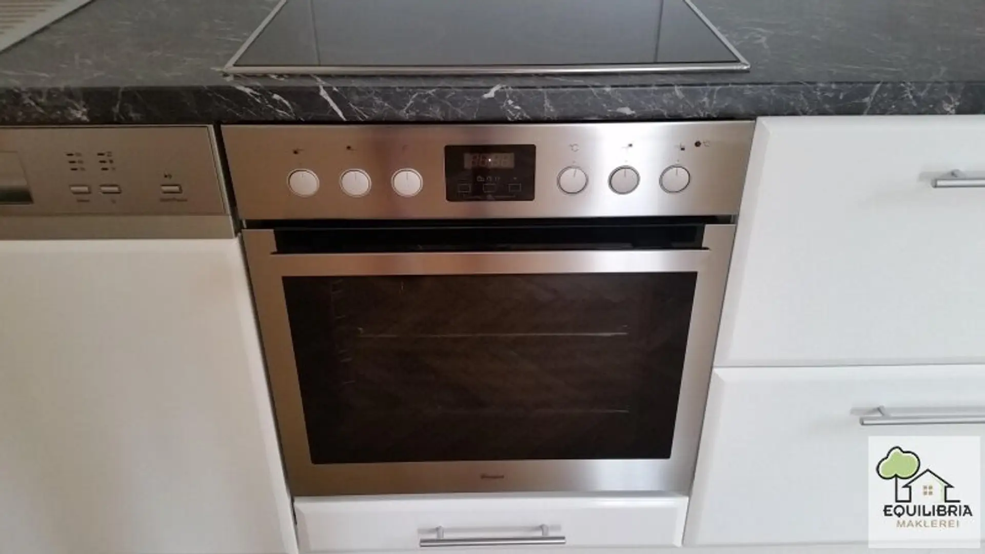 Rechts vom Vorraum gelangt man in das neu verflieste WC mit Zentralheizung und Handwaschbecken sowie in die Küche. Diese besticht durch einen weißen Lackverbau mit schwarzer Arbeitsplatte sowie einen Herd mit Ceranfeld, Dunstabzug, einen Geschirrspüler, einen Einbaukühlschrank und eine Nirosta-Spüle.