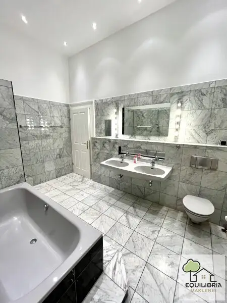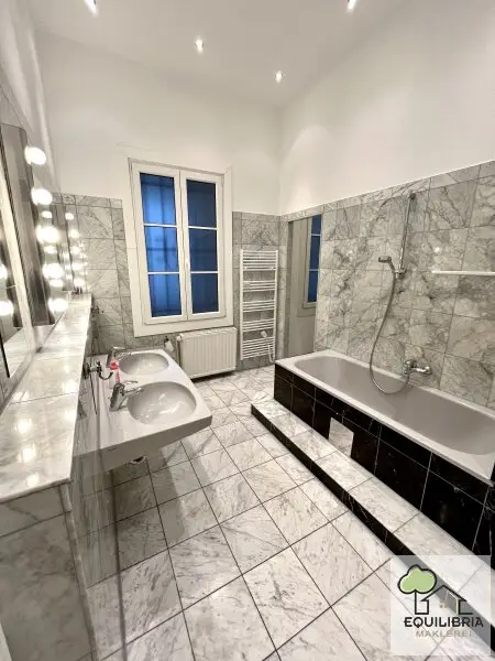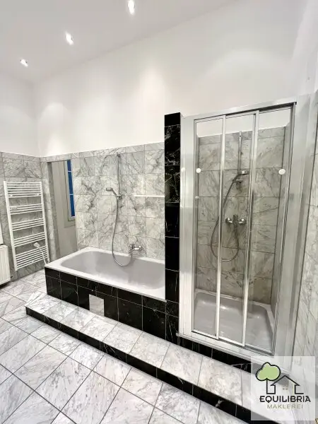 Links vom Vorraum gelangt man über einen weiteren kleinen Vorraum (ca. 2 m²) in das Bad, welches mit einer Dusche und einer Badewanne sowie einem Doppelwaschbecken ausgestattet ist und weiter in ein Kabinett mit Gangfenster.