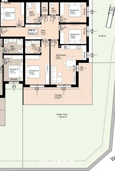 Die gegenständliche Wohnung TOP 3 ist im EG angesiedelt und hat bei einer Gesamtfläche von ca. 108,44m² folgende Raumaufteilung