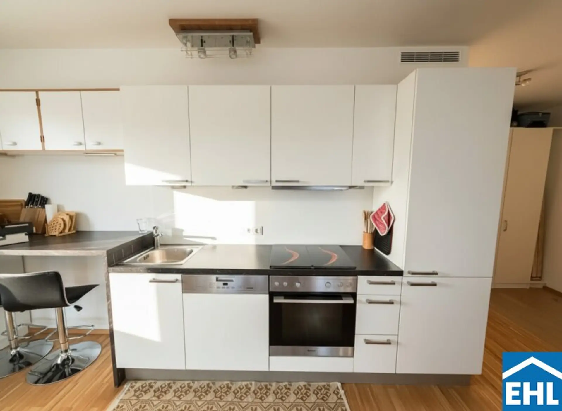 * Parkett in den Wohnräumen, edles Feinsteinzeug in den Sanitärräumen