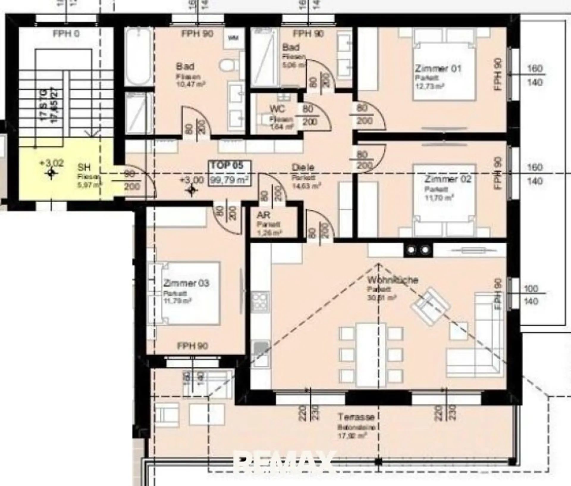 Die gegenständliche Wohnung TOP 5/1 ist im OG angesiedelt und hat bei einer Gesamtfläche von ca. 99,79m² folgende Raumaufteilung