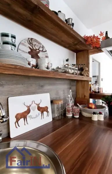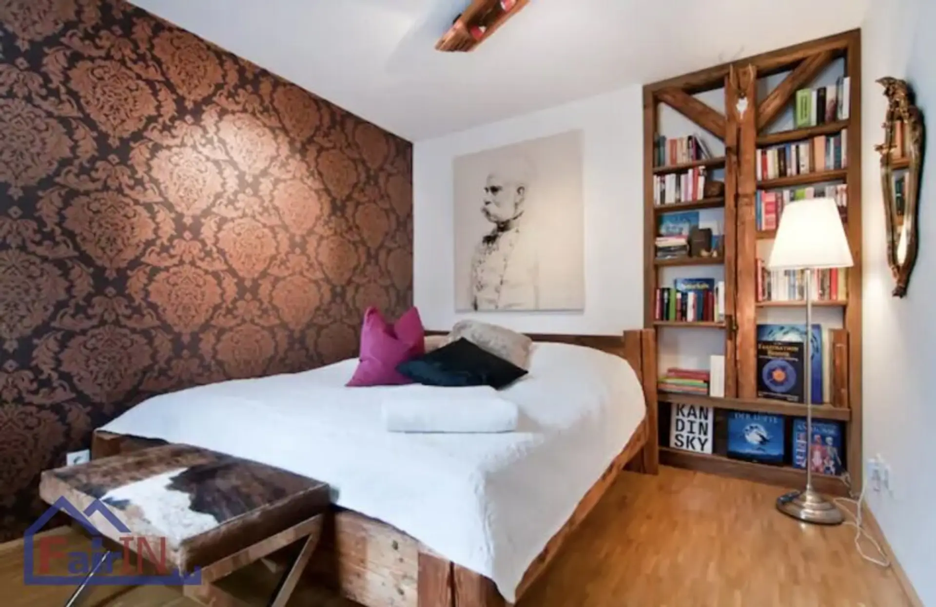 Die mit Altholzelementen ausgestattete Küche bildet ein apartes Detail, das der Wohnung durch eben diesen Stilmix einen besonderen Chic verleiht. Der hochwertige Parkettboden und die modernen Fliesen unterstreichen den Eindruck eines urbanen Apartments, das dennoch nicht auf Gemütlichkeit und Ambiente verzichtet.
