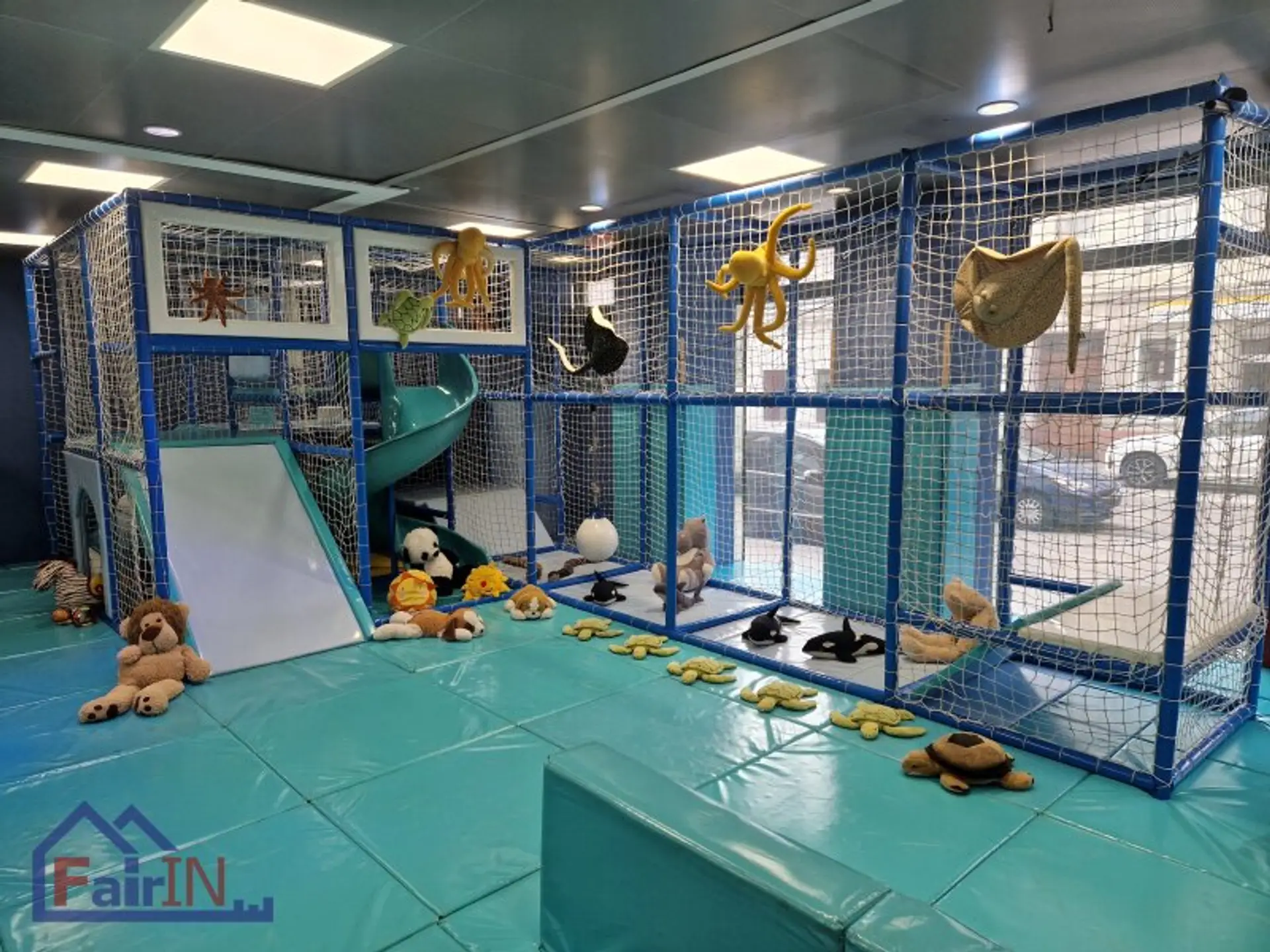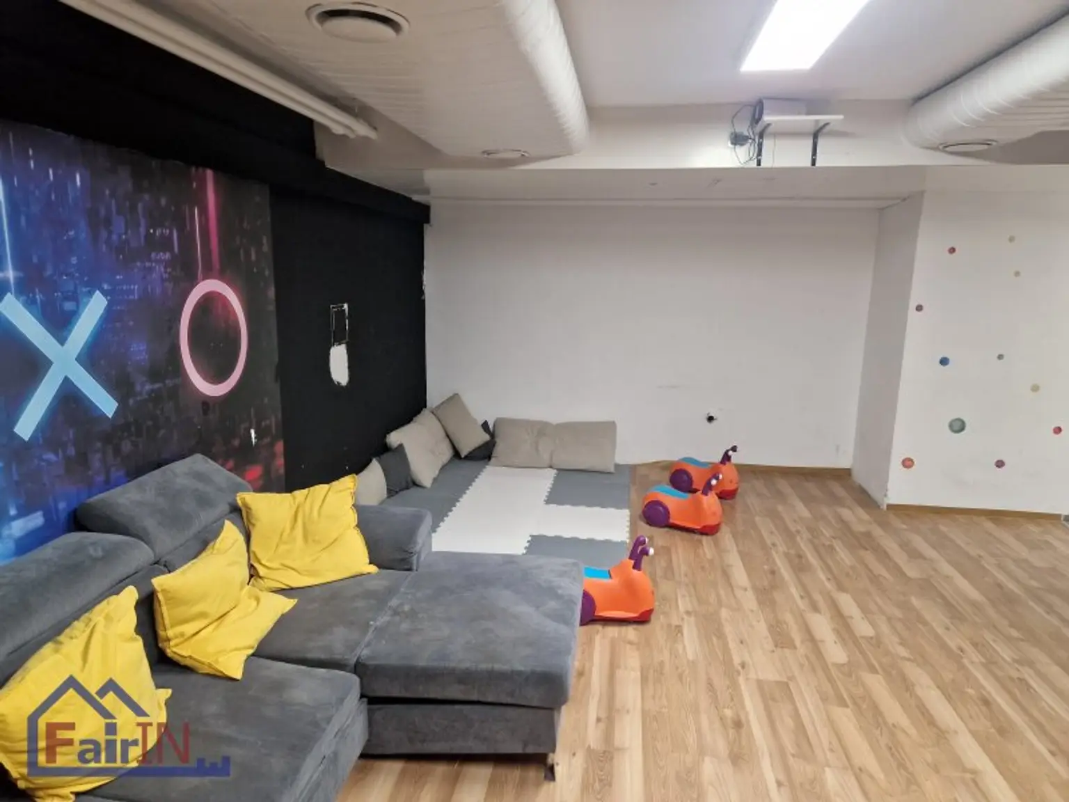 Im unteren Bereich gibt es ein Kinderkino mit 18 m² sowie einen Raum mit Fernseher und Spielzeug für Kinder mit einer Fläche von 35 m². Zusätzlich befinden sich auf dieser Ebene ein Wickelraum für Babys, eine separate Toilette für Kinder sowie ein WC für Erwachsene.