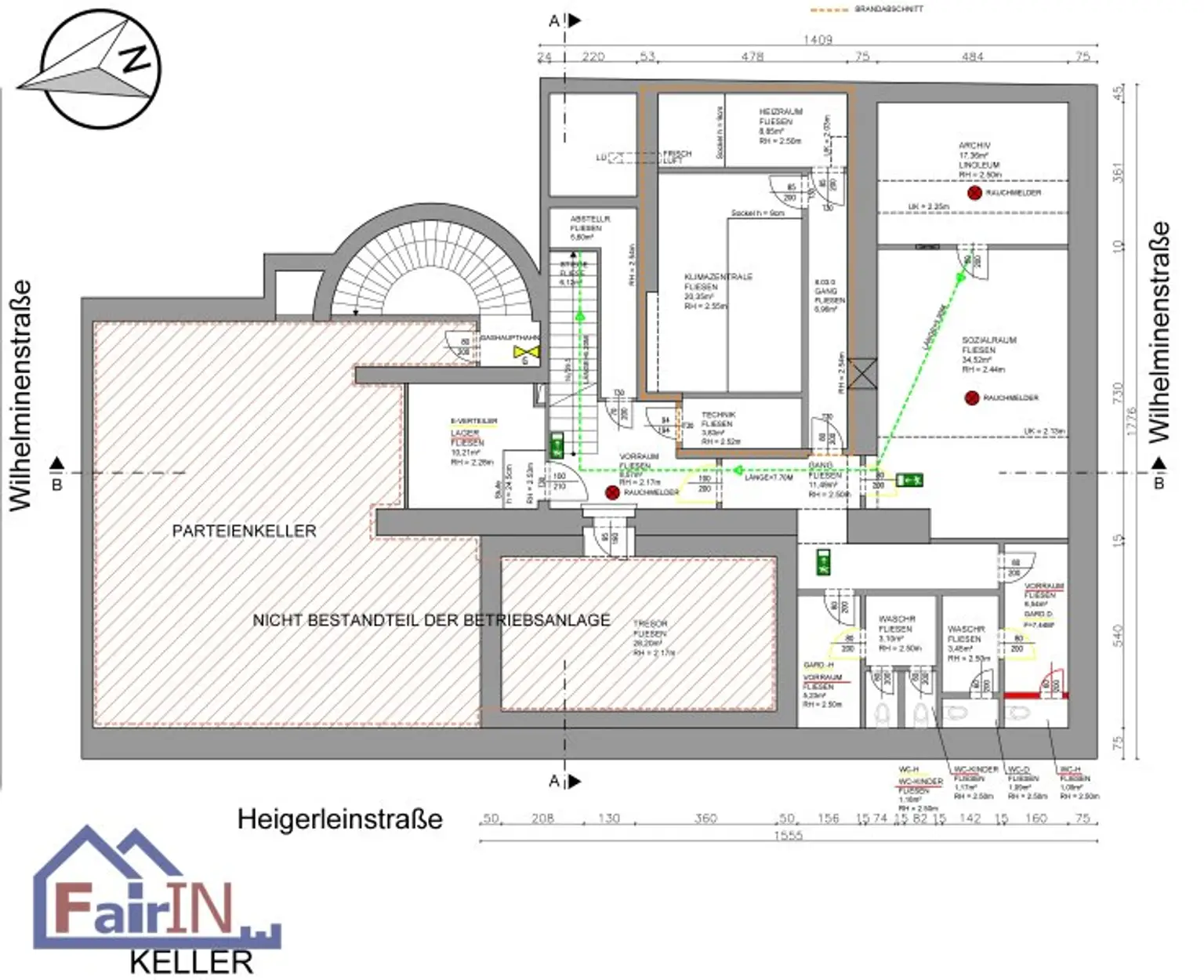 Weitere Räume umfassen mehrere kleine Lagerräume, einen Technikraum (Heizraum) und ein Belüftungssystem (Lüftung).