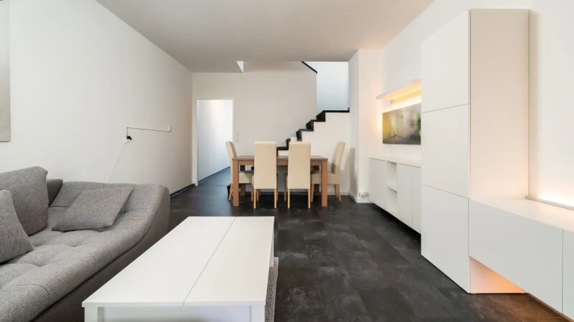 Der anschließende Wohn-Essbereich besticht durch seine Größe, Helligkeit und die vom Voreigentümer installierte indirekte Beleuchtung, die dem Raum eine besondere Atmosphäre verleiht. Von hier aus gelangt man auf die gemütliche Loggia/Terrasse.
