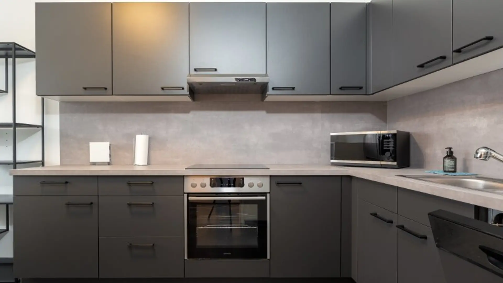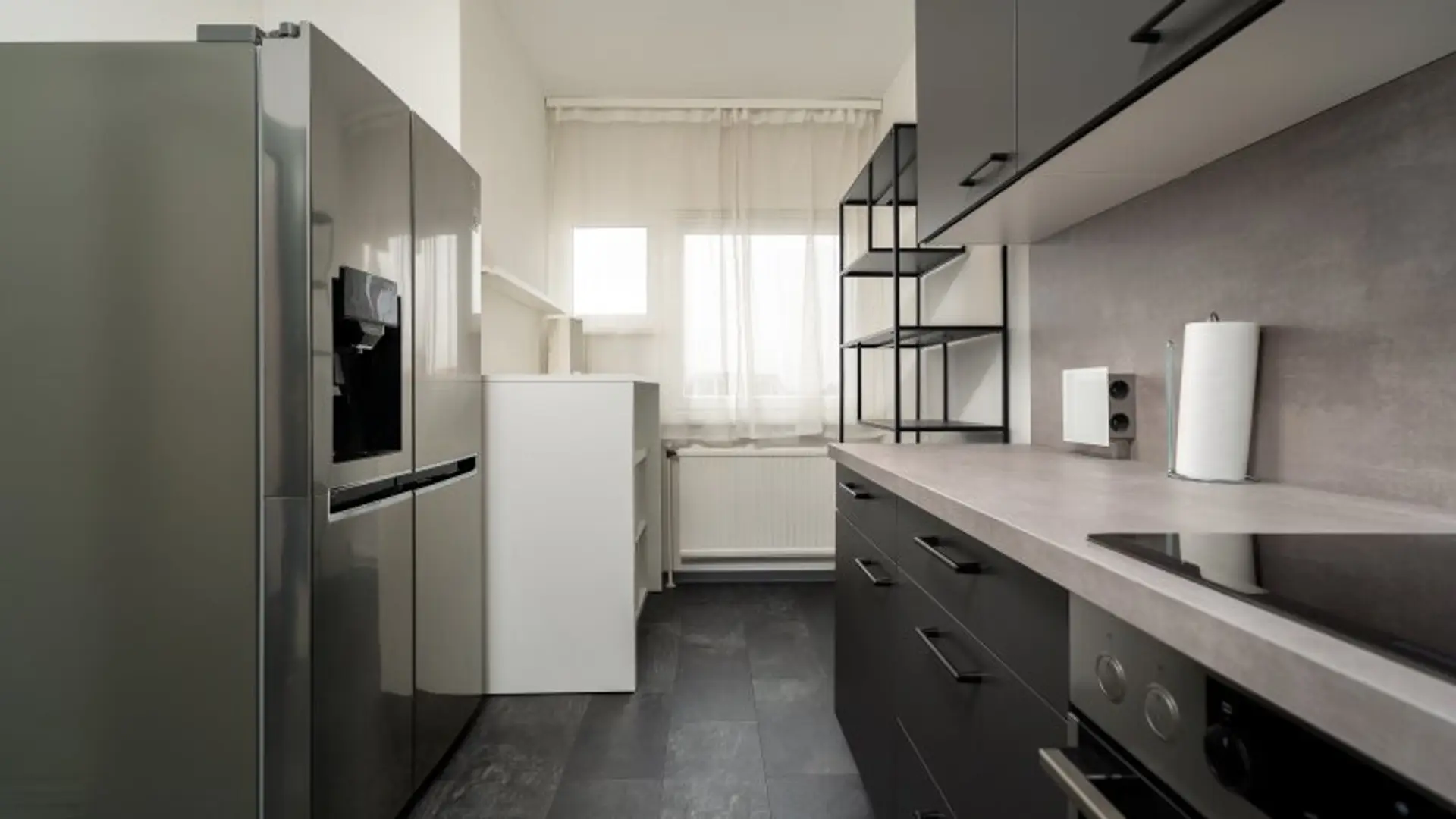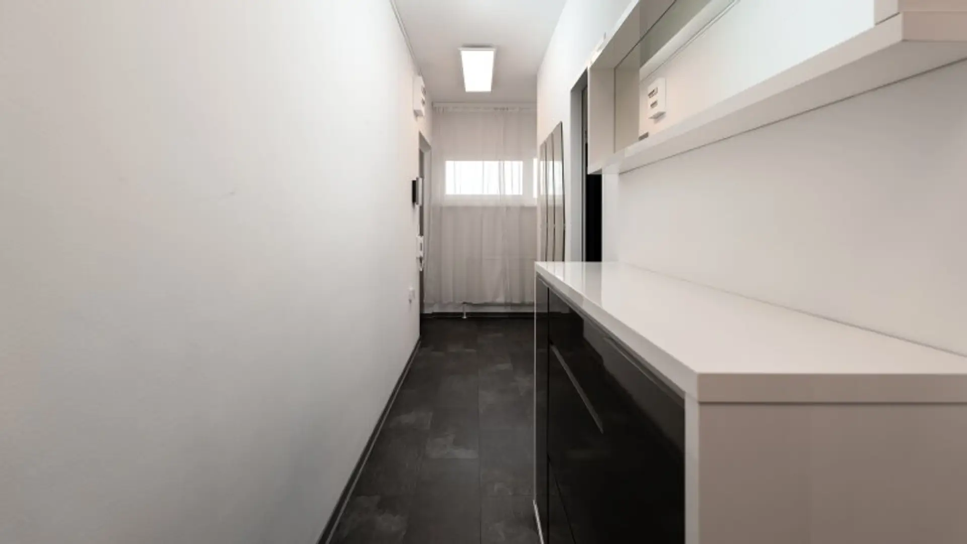 Beim Betreten der Wohnung gelangt man in einen hellen Vorraum, der ausreichend Platz für Garderobe und Schuhe bietet. Linkerhand befindet sich die großzügige Küche, die auch Platz für einen Side-by-Side-Kühlschrank bietet.