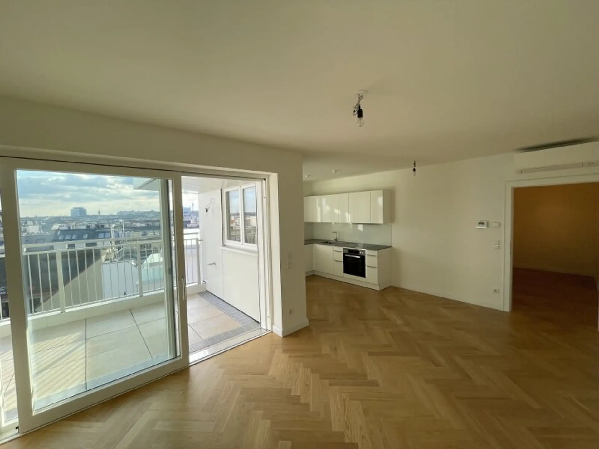Von der Terrasse vor dem Wohnzimmer geniesst man einen unvergleichlichen Panorama-Blick über die Dächer Wiens!