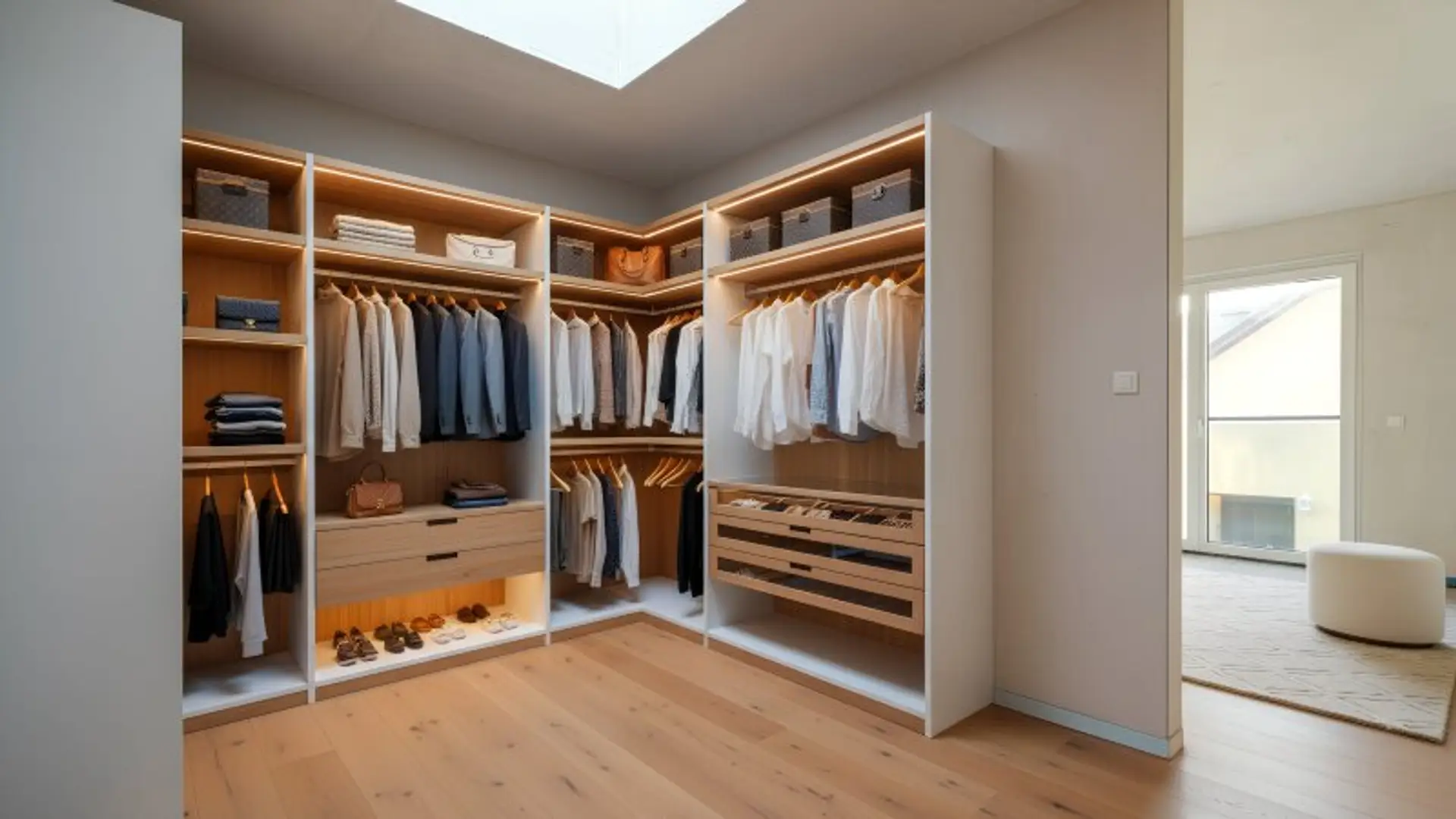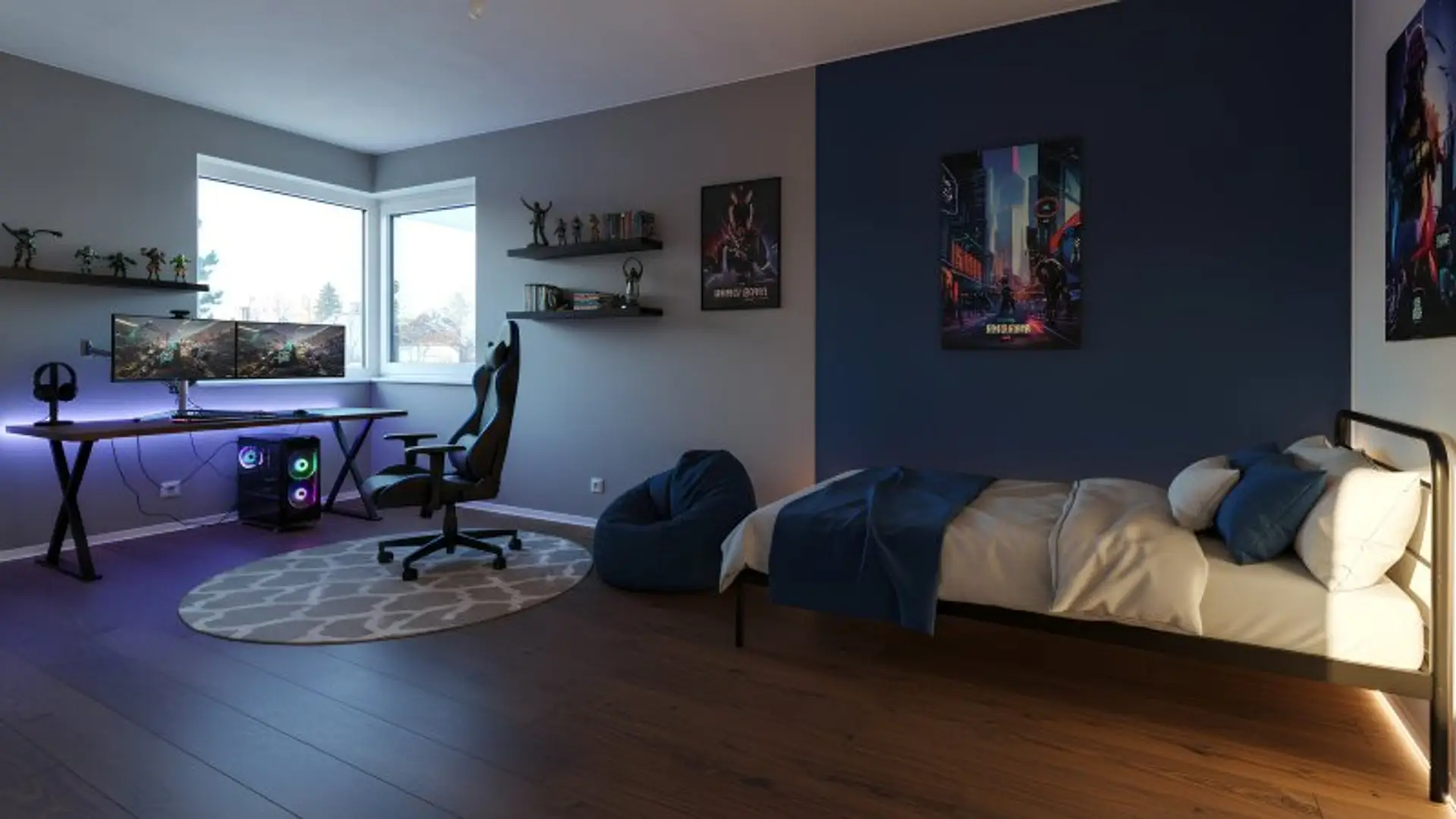 Beim Betreten des Hauses befindet sich rechterhand ein Garderobenbereich, am Ende davon ein WC mit Handwaschbecken. Linkerhand liegt das erste Zimmer, das sich ideal als Homeoffice oder Gästezimmer eignet. Ebenfalls auf dieser Seite befindet sich der Technikraum, in dem die hochwertige Haustechnik untergebracht ist. Unter der Treppe wurde zudem ein praktischer Abstellraum eingeplant.
