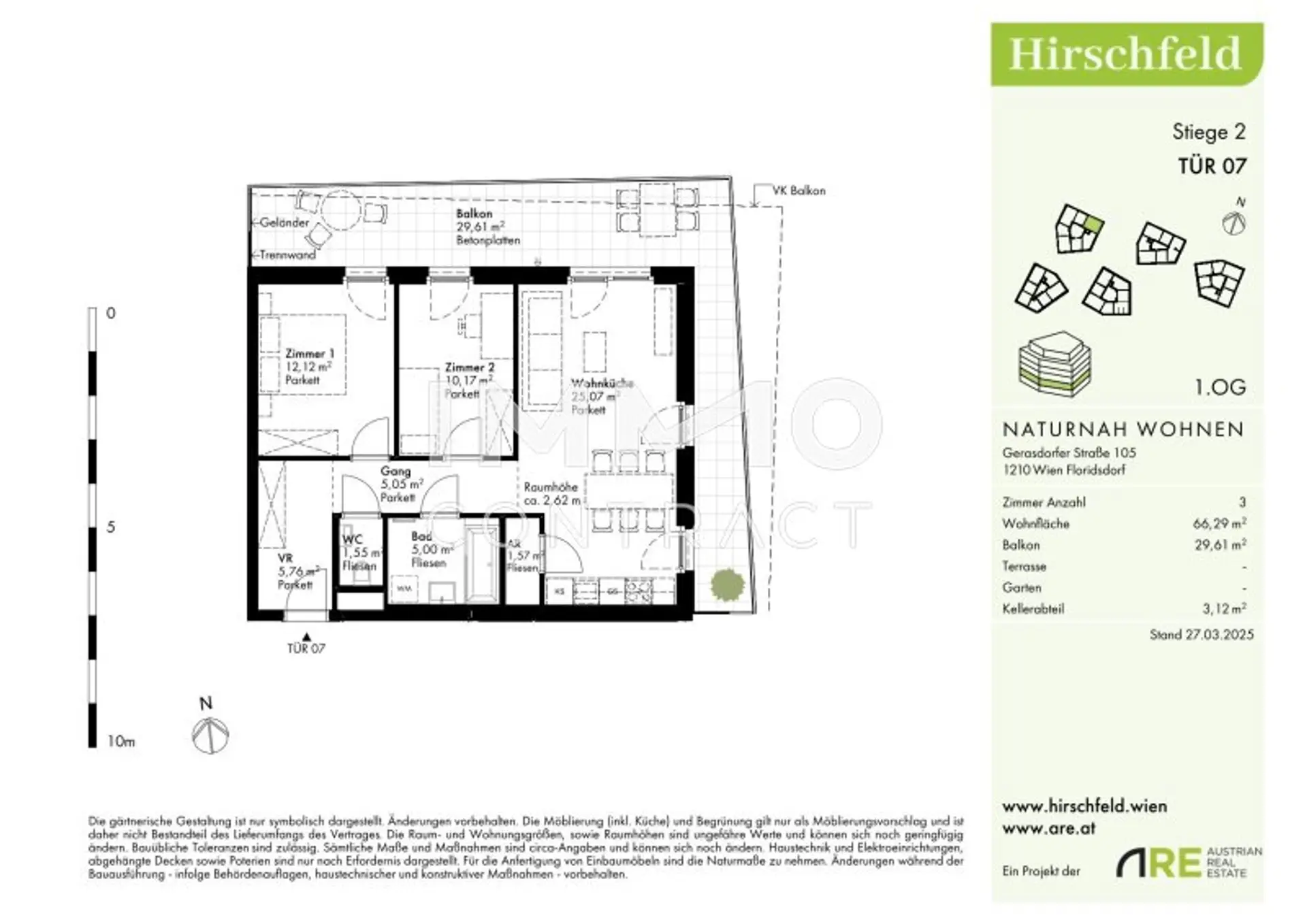 Hirschfeld ist ein beschauliches Viertel am Wiener Stadtrand. Die Metropole im Rücken verheißt jedem Nachhausekommen ein Naturerlebnis und Entspannung. Wer gerne mit den Wiener Linien unterwegs ist, nimmt am besten die Autobuslinie 32A ab Kollarzgasse bis zum U- und S-Bahn-Knotenpunkt Leopoldau. Von hier aus ermöglichen die U1 in Richtung Zentrum sowie die Schnellbahnlinien S1, S2 und S7 eine rasche Verbindung stadtein- und stadtauswärts. Alternativ verläuft die Straßenbahnlinie 31 entlang der Brünner Straße über Floridsdorf direkt bis Schottenring. Autofahrer profitieren von der nahegelegenen A22.